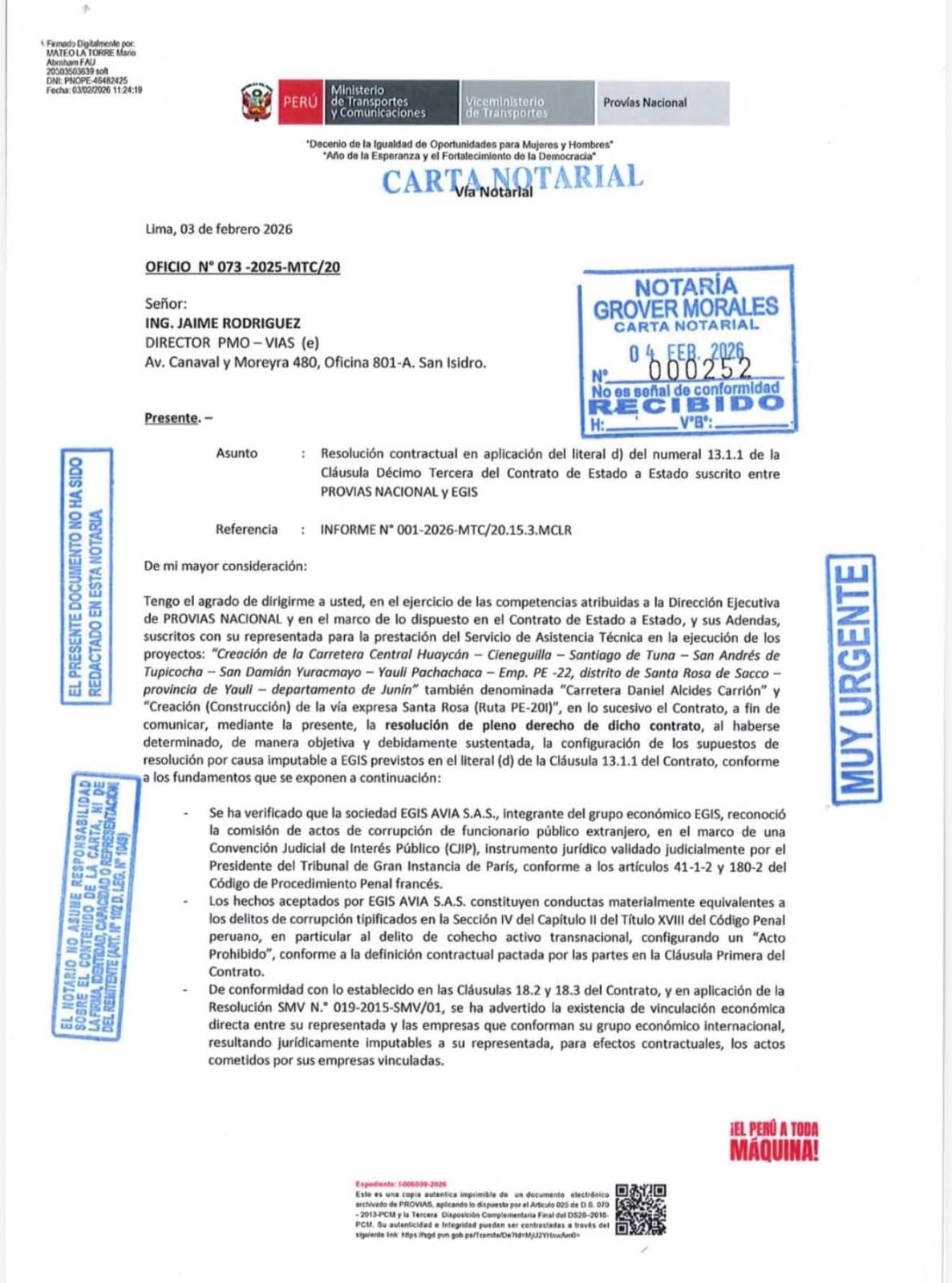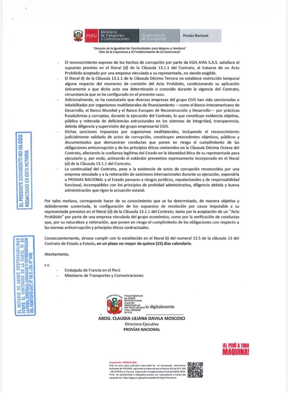 En una carta notarial que envió la directora Ejecutiva de Provías, Claudia Liliana Dávila Moscoso, a su similar de PMO Vías, Jaime Rodríguez, se le comunica “la resolución de pleno derecho de dicho contrato” acusando a la empresa EGIS AVIA S.A. S de haber participado en actos de corrupción.