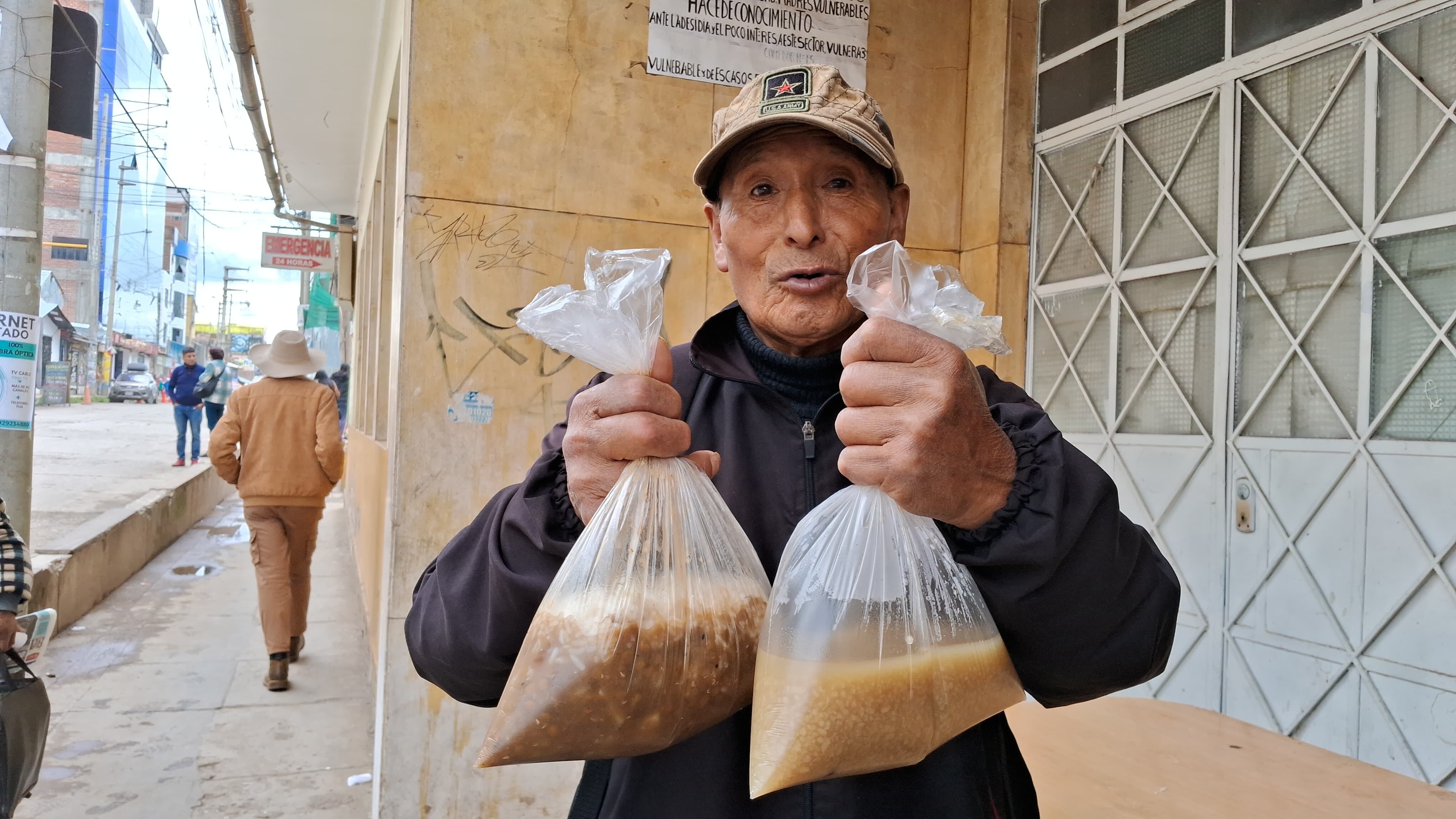 “Yo llevo en bolsa mi menú, aquí ni siquiera nos dan una banca, porque nadie quiere hacerse cargo del comedor, antes comíamos adentro y ahora nos tratan de esta manera”, reclamó el anciano de 80 años Raúl Taype, que lleva la comida en bolsa a la casa que cuida. Tiene miedo, ya que la comida está caliente y teme que se pueda derramar y causarle una quemadura.