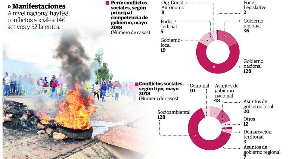 Durante mayo, la Defensoría del Pueblo detectó 198 conflictos sociales, la cifra más alta en los últimos 12 meses. Según el reporte hay 146 conflictos activos y 52 puedes estallar en cualquier momento.