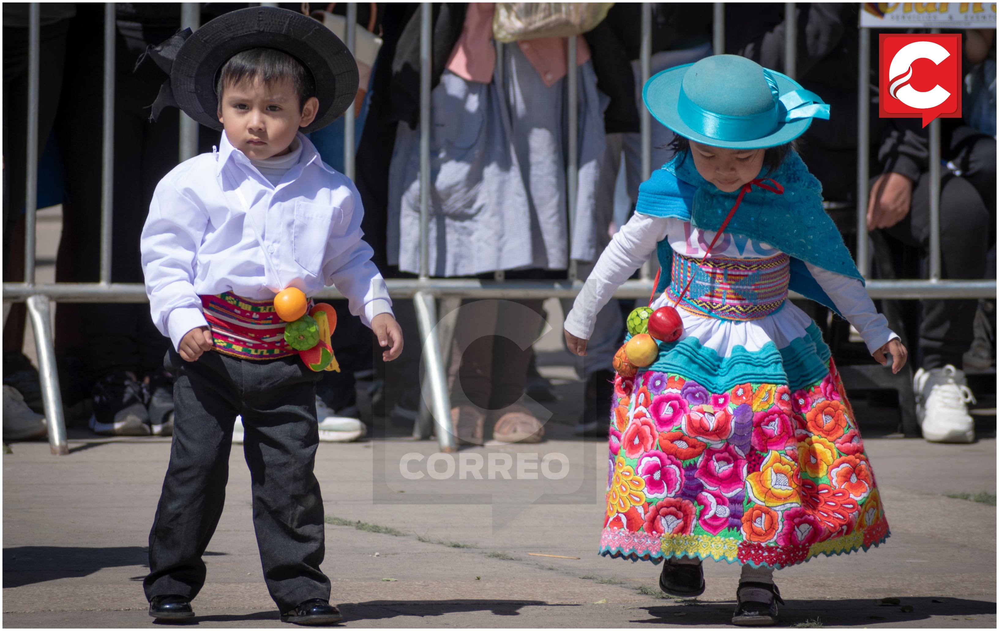 Las niñas vestían su colorido fustán, llevaban colgadas sus huallas de frutas, mientras que los varones tenían la manta cruzada en el pecho y una faja que les ajustaba el pantalón.