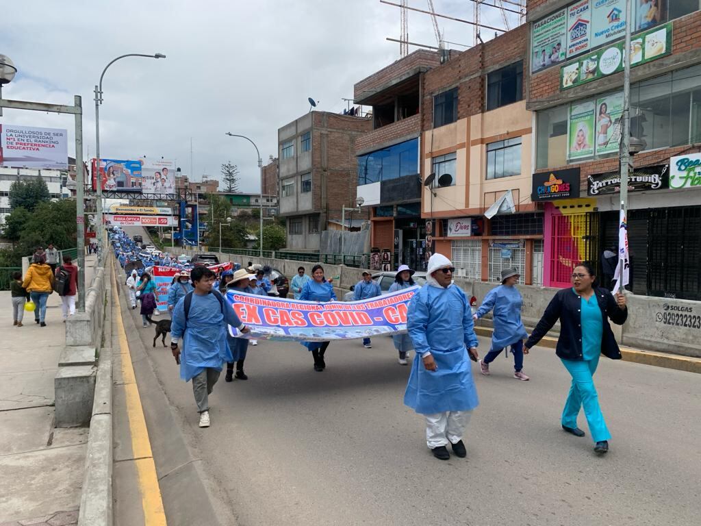 Decenas de trabajadores del sector salud se movilizaron por la calle Real y realizaron un plantón en el parque Huamanmarca. “El gobierno durante la pandemia nos prometió el nombramiento. Tengo compañeros que ganan S/1400, S/2100 y S/2500, no alcanza para la canasta básica que se ha incrementado en los últimos meses. Tenemos estudios universitarios y maestrías, no podemos tener ese sueldo irrisorio. Un policía gana S /3500, un profesor gana S/ 3100, por qué al trabajador del sector salud lo discriminan”, remarcó. Participaron trabajadores del hospital El Carmen, Carrión, EsSalud, y otros establecimientos.