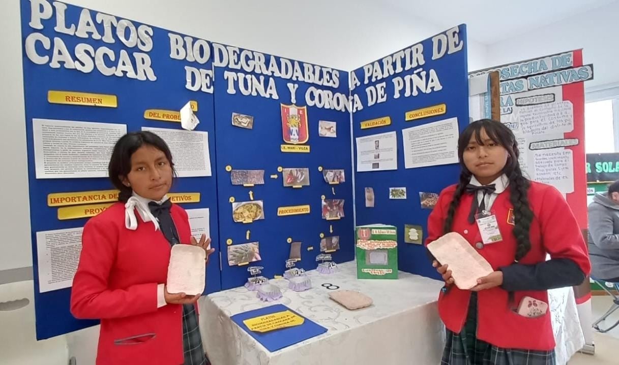 Entre los proyectos que resaltaron, se encontraron el presentado por el grupo de trabajo del colegio Wariwillka de Huayucachi, quienes elaboraron platos biodegradables elaborados a base de cáscara de tuna y corona de piña.