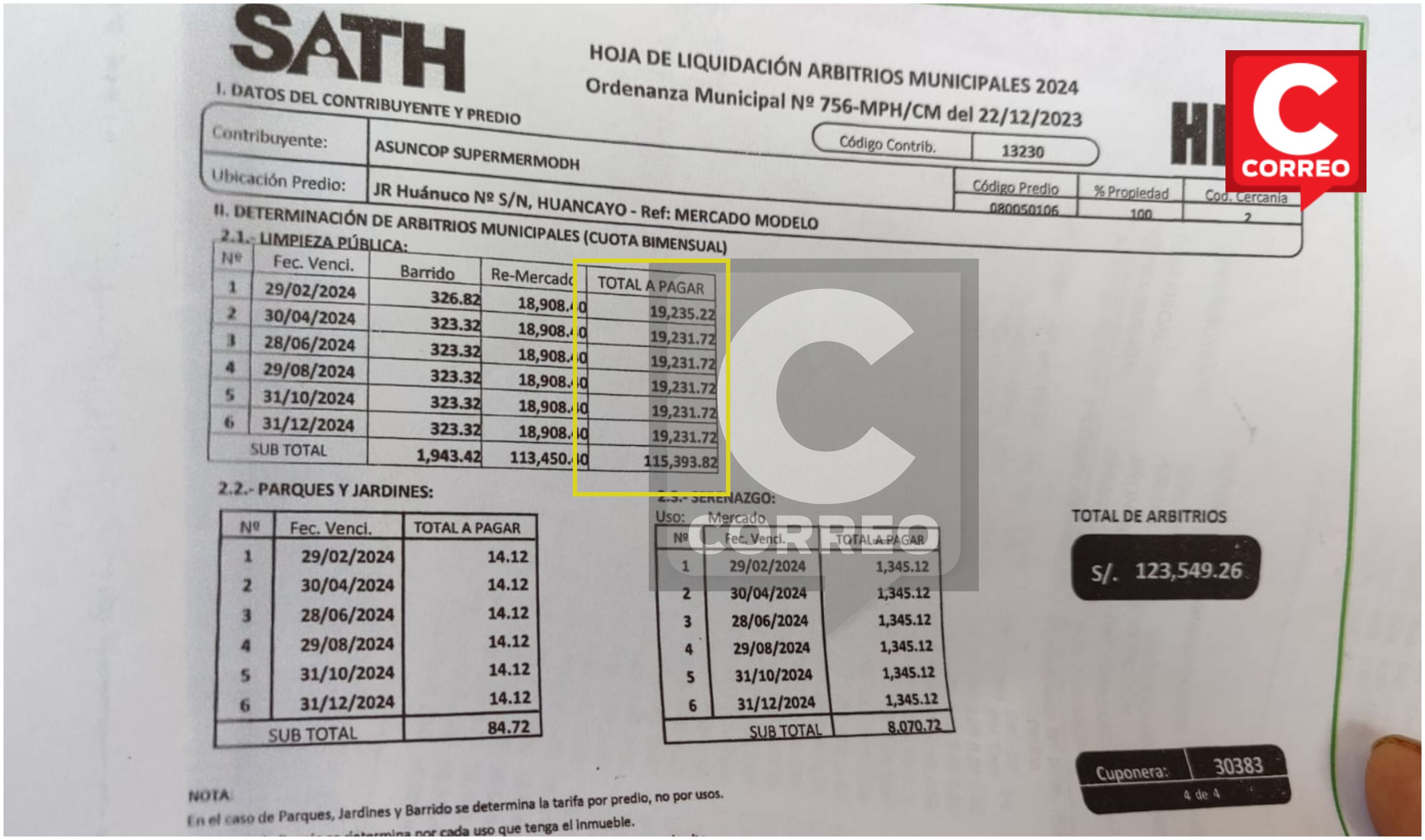 El monto total de arbitrios municipales que paga el Mercado Modelo de Huancayo, es de 123 mil soles y solo por de limpieza pública la suma asciende a 115 mil soles.