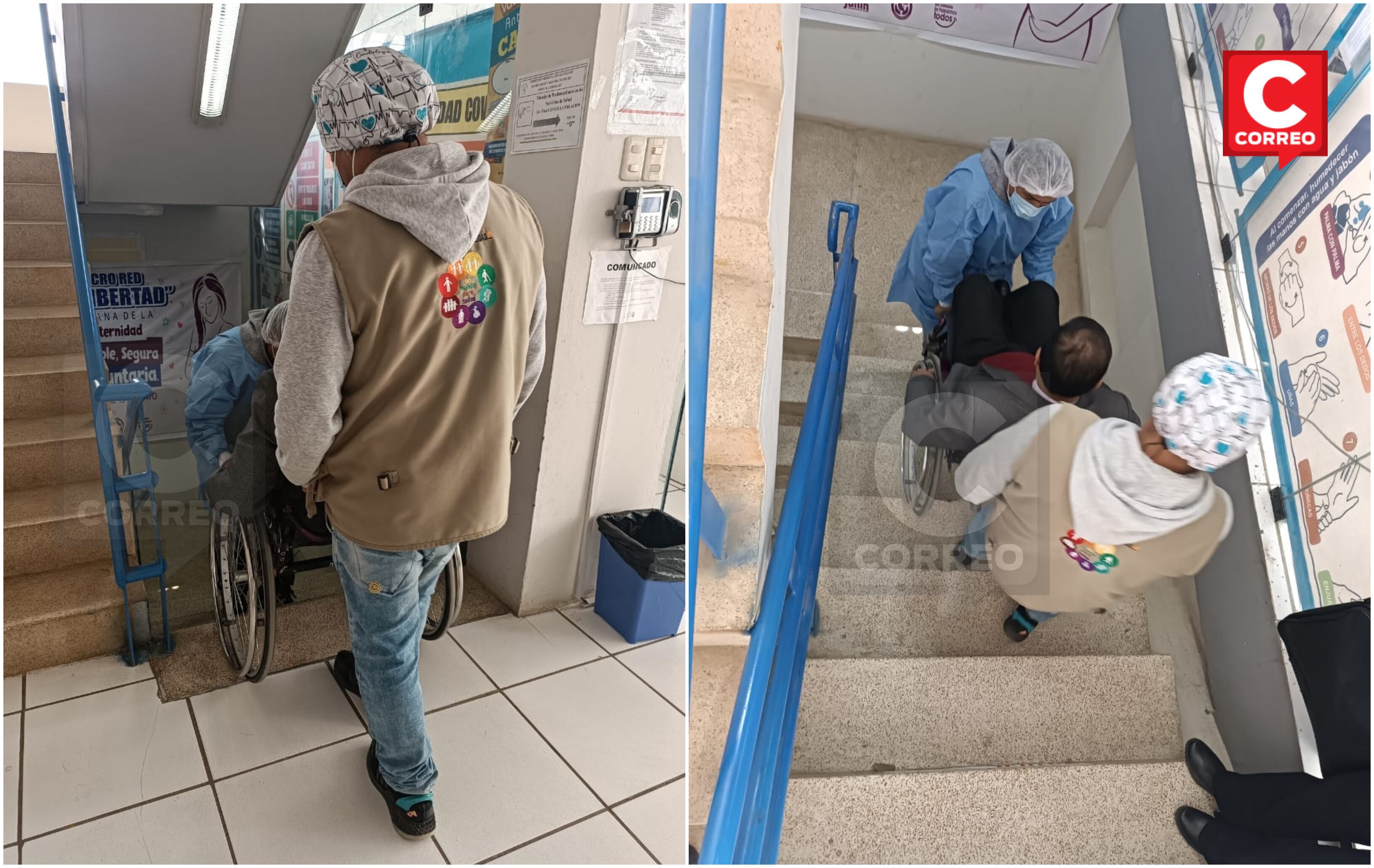 En unas fotografías, que fueron alcanzadas a la Defensoría del Pueblo, se puede ver como el personal de salud tiene que ayudar a levantar a una persona en silla de ruedas hasta el segundo piso por las gradas.