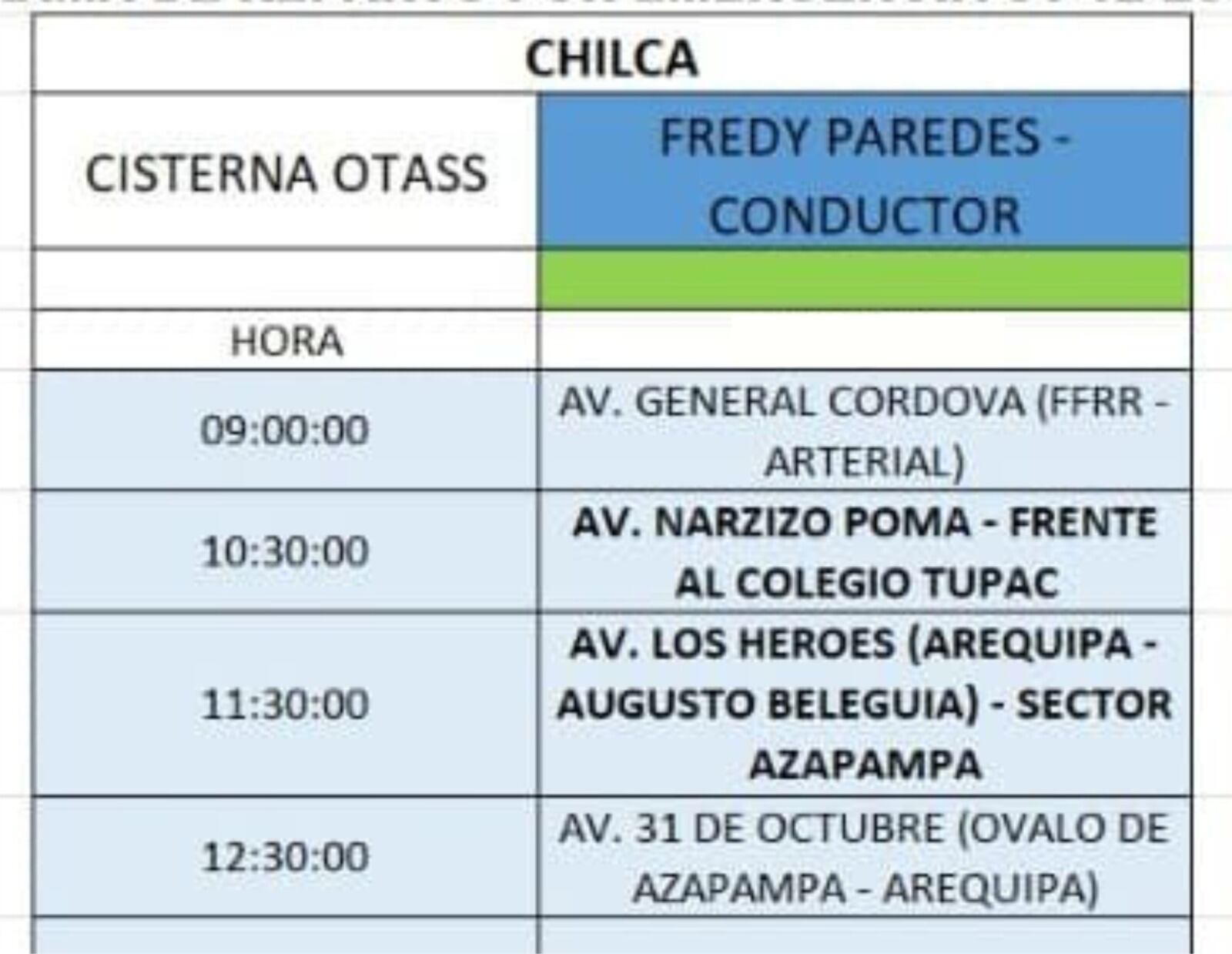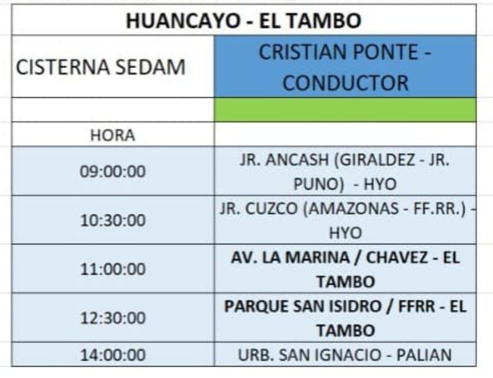 Para atenuar el impacto, la empresa emitió un cronograma de distribución en cisternas por dicho espacio de tiempo. El gerente Operacional de la EPS Sedam Huancayo, Miguel Medina, dio a conocer que se ha registrado la rotura de la tubería de 24″ a la altura del kilómetro 5.6 (Chamisería) de la carretera Palián – Parihuanca. La red traslada agua a la planta de tratamiento de Vilcacoto para su potabilización.
