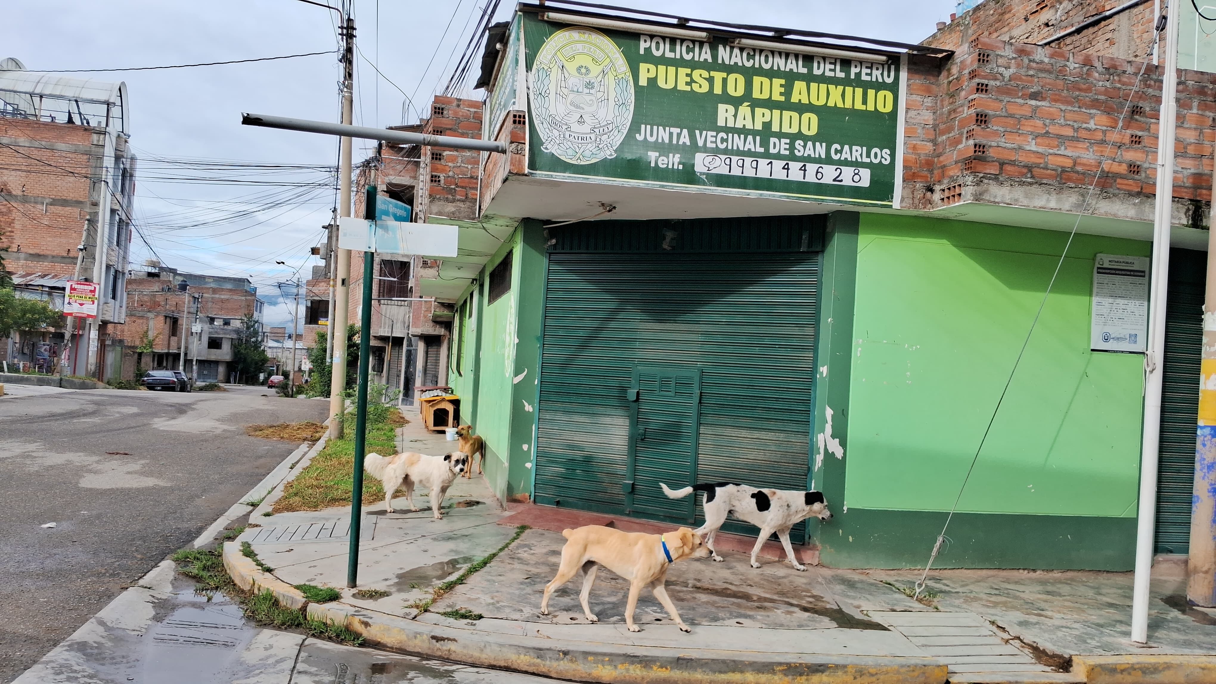 En el sector de San Carlos de Huancayo los robos y asaltos son cosa de todos los días. Desde que cerró el puesto de auxilio rápido, por falta de pago, solo quedó el letrero y 4 perros “Police dog” que en la actualidad son los únicos que protegen al vecindario.