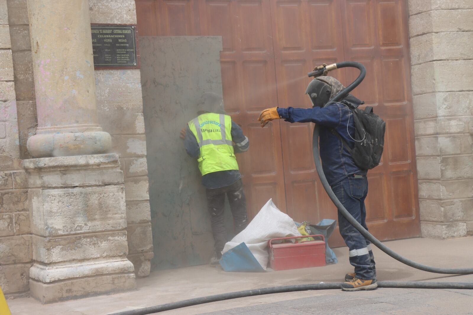 “Para el retiro de la pintura, hemos usado la técnica del arenado, que consiste en usar una compresora con pistola y un repositorio de arena fina, y con presión se impacta en las manchas de pintura para removerlas”, detalló.