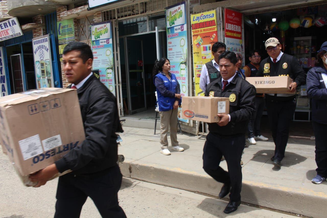Personal del Ministerio Público, Municipalidad de Chilca, Dirección Regional de Salud y la Policía Nacional intervinieron tres establecimientos. El primero fue la librería “Orazal” en la av.Huancavelica n°620, la librería “Señor de Muruhuay” en av. Huancavelica n°718 y la librería “Canipaco” en la av.Huancavelica n°622. Se incautó 7 cajas con un peso de 120 kilos de útiles escolares como plumones, temperas, lapiceros, baja lengua de colores, rompecabezas, tajadores, paletas para temperas, corrospum de colores, pintura acrílica y otros útiles de escritorio, tóxicos no aptos para el uso humano y sin registro sanitario.