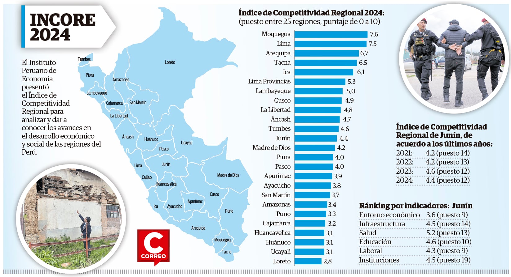 El Instituto Peruano de Economía (IPE) publicó el Índice de Competitividad Regional (INCORE) 2024, y Junín ocupa el puesto 12 de 25 regiones. Junín conservó su puesto como la decimosegunda región más competitiva. El resultado se explica principalmente por el avance en cuatro ubicaciones en el pilar Laboral, ante la reducción de la brecha de género en ingresos. También se demostró un ascenso de tres posiciones en el Entorno Económico debido a la mayor tenencia de cuentas en entidades financieras. Sin embargo, la región retrocedió cuatro puestos en el pilar Instituciones ante la inseguridad ciudadana, entre otros.