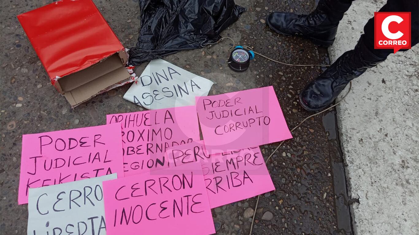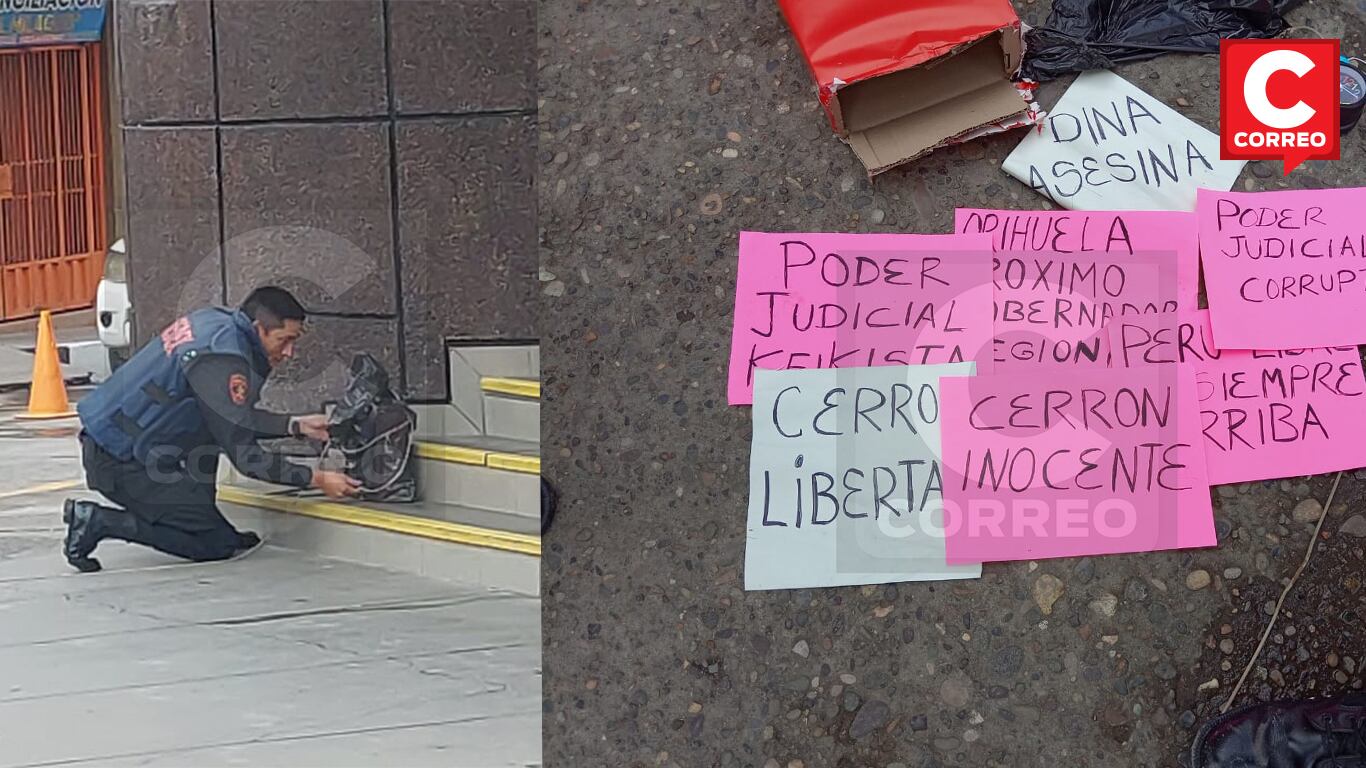 En el interior de la caja encontraron un reloj despertador artesanal y hojas escritas con mensajes alusivos a Vladimir Cerrón, la presidenta Dina Boluarte y Keiko Fujimori que decían “Cerrón libertad”, “Cerrón inocente”, “Dina asesina”, “Poder Judicial keikista” y “Perú Libre siempre arriba”. La Policía Nacional realizará la inspección de cámaras de seguridad para verificar quién fue el autor de hecho.