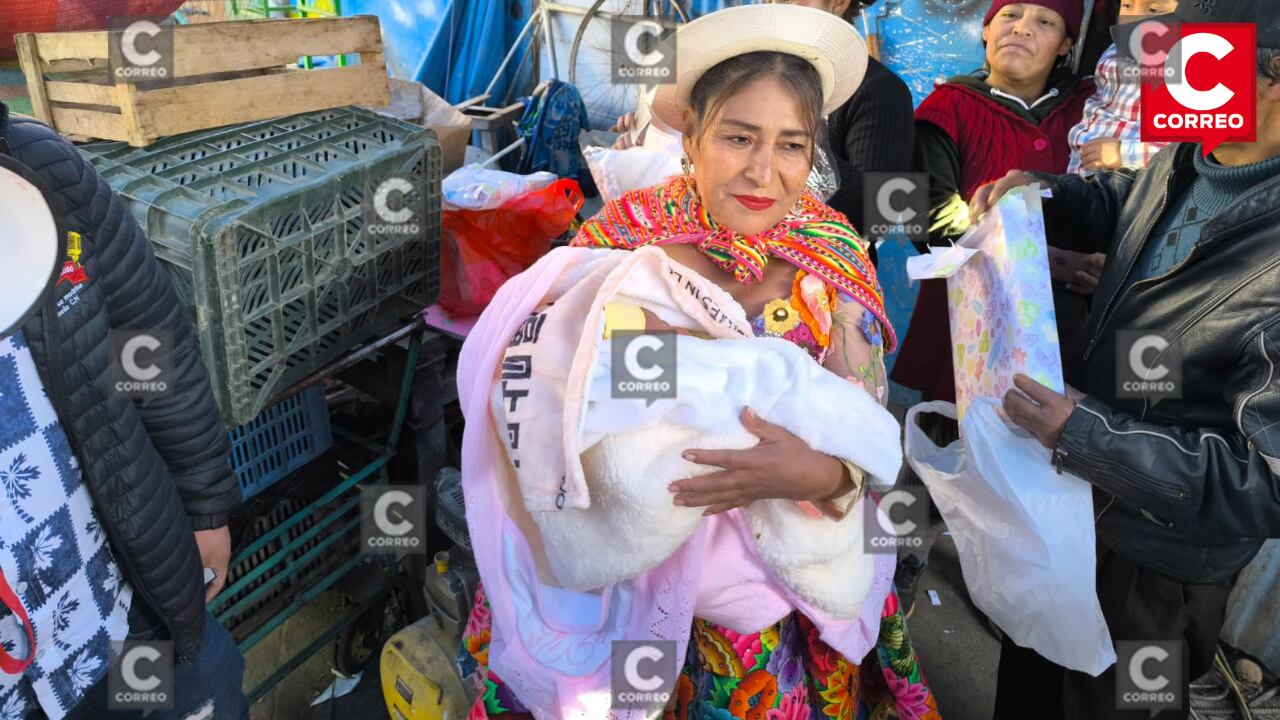 En medio de preocupación e incertidumbre, Martina de los Andes llevó un poco de alegría a la familia de Emilio Ventura Cunya, padre de la recién nacida y esposo de Imelda Roque (39). Cantando Santiago, con una colcha y ropa hizo su entrada al mercado Nuevo Amanecer Huanca, el señor Emilio la recibió con su hija recién nacida en brazos. “De todo corazón gracias por avisarme de este caso, quise comprarle leche, pero no sé que fórmula toma, por eso prefiero darle en efectivo”, dijo la cantante y le entregó un monto de dinero al padre.
