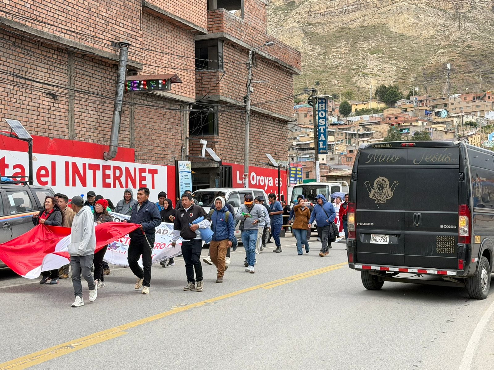 En La Oroya, bajo una persistente lluvia y con resguardo policial, un grupo de 100 manifestantes que llegaron sobre todo de la selva central, realizaron una marcha por un carril de la carretera central, desde el sector de Huaynacancha a la altura del km 166 hasta el paradero de Tarma.