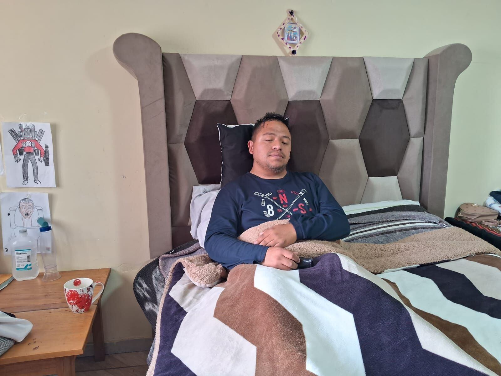 “Siento que es una nueva oportunidad de vida que me da (el Señor de los Milagros), son pruebas que nos da Dios, y esta vez me tocó a mi”, exclamó, Jack Poma, postrado en su cama. Este padre de 35 años, era el sostén de su hogar ya que trabaja en una cevichería, pero también es músico en una conocida agrupación, cuyas presentaciones fueron canceladas, ya que no saber cuando más durarán sus terapias de recuperación, en vista que tiene una pierna lesionada.