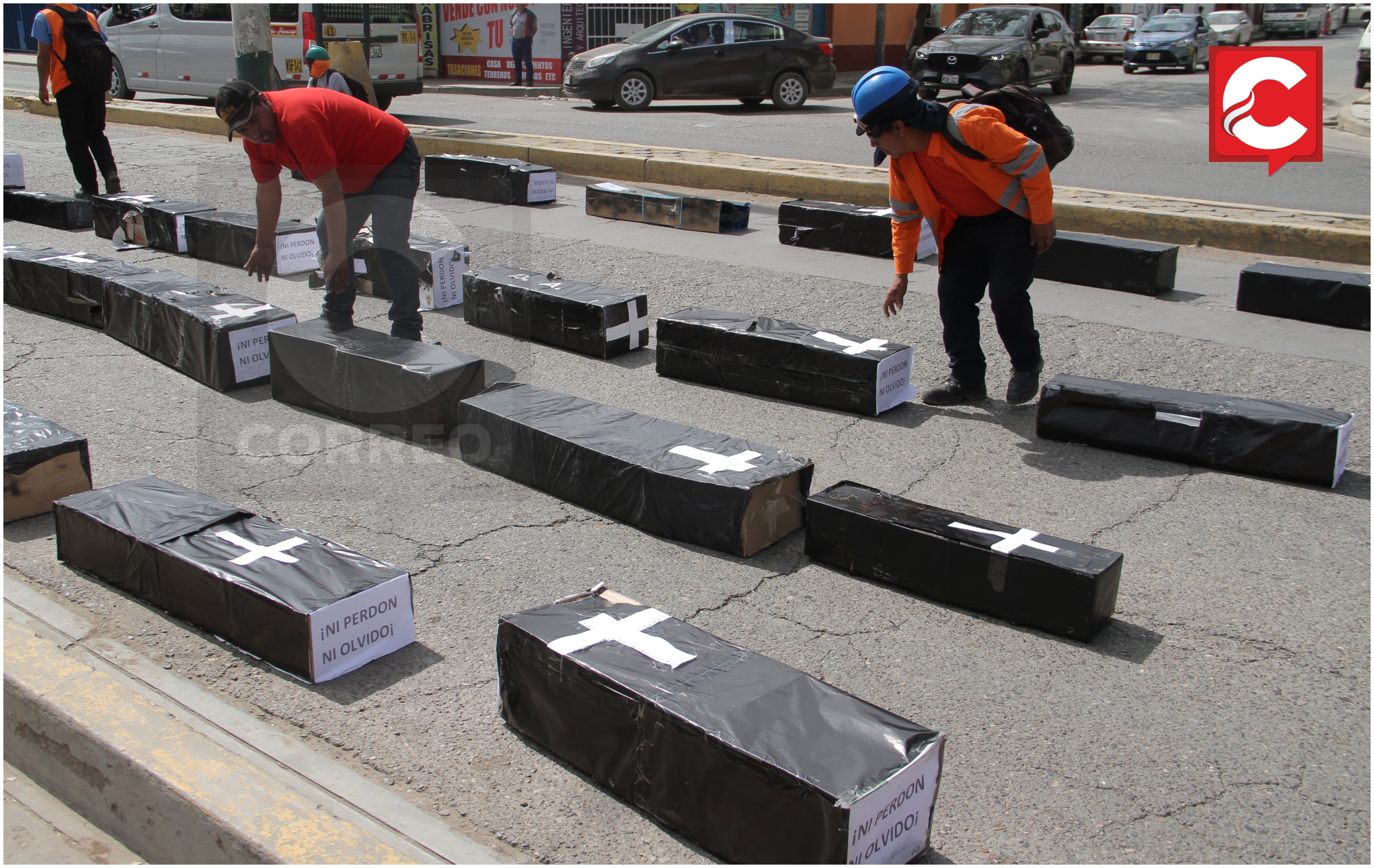 El gremio de obreros de construcción preparó más de 60 ataúdes de cartón envueltos en papel negro, como símbolo de los pobladores que perdieron la vida en Puno y Ayacucho en las protestas de inicios de año. Presentaron algunas alegorías sobre la muerte y con bombos marcharon de Huancayo hacia El Tambo. Allí, frente al estadio Castilla, pusieron estos ataúdes en fila, en medio de la pista, en un acto simbólico reivindicativo.