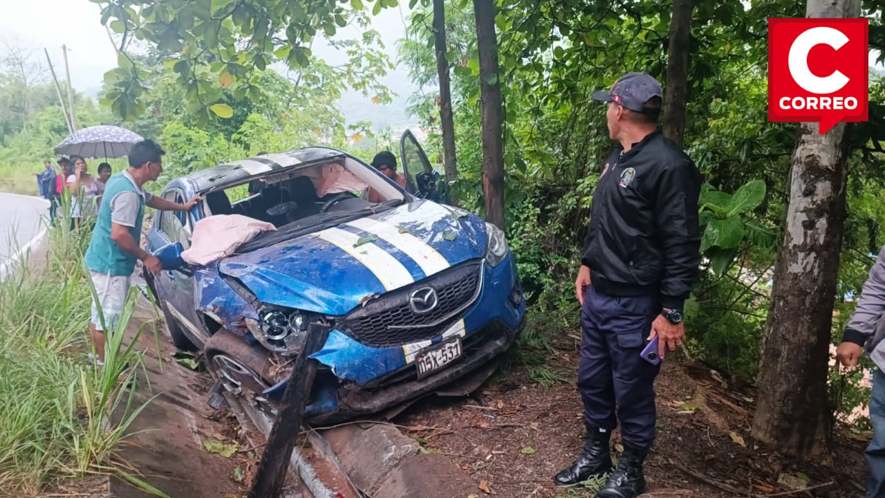 Un despiste vehicular se registró en la conocida curva de Amaya, en el ingreso al distrito de Perené, cuando un automóvil Mazda de color azul y blanco, con placa D5X-531, se salió de la vía por causas que aún son materia de investigación.
