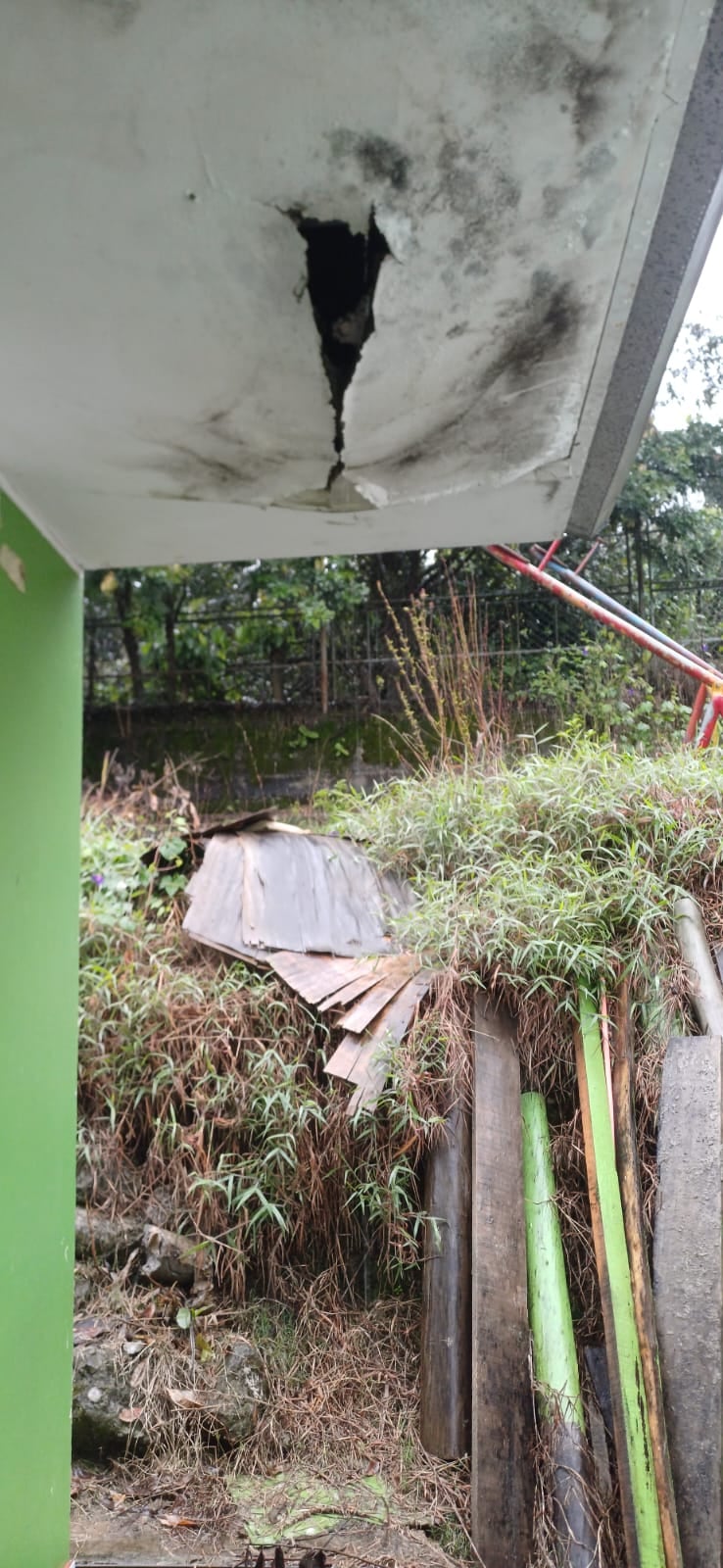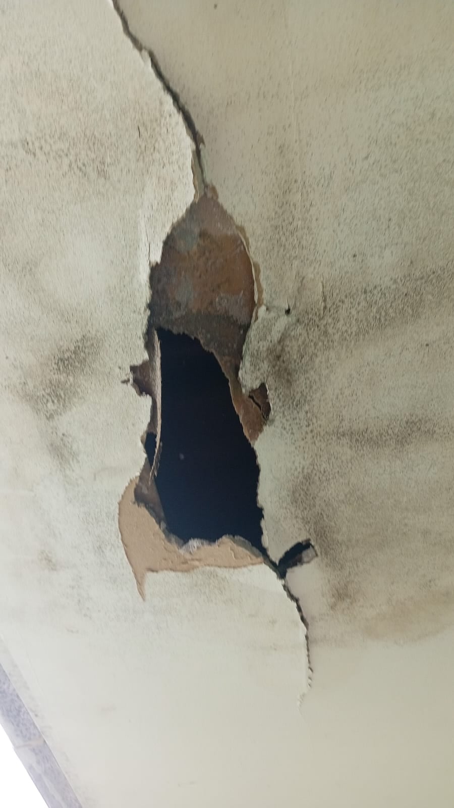 Según video y fotos que fueron enviados a nuestra redacción, el centro educativo tiene forados en las paredes y techos constituyendo un riesgo para los niños.