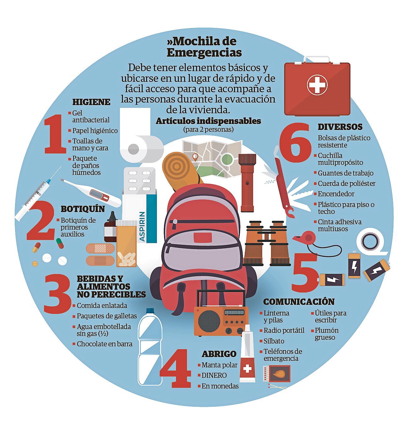 “Esta mochila debe tener un peso aproximado de 8 kilos y contar con bolsillos internos, laterales y frontales según disponibilidad”, informó el Indeci. Incluso debería tener productos de bioseguridad para prevenir contagios de COVID-19 como mascarillas, jabón, protectores faciales, alcohol (líquido o en gel), guantes, un envase de lejía debidamente identificado y botellas de agua (ver infografía).