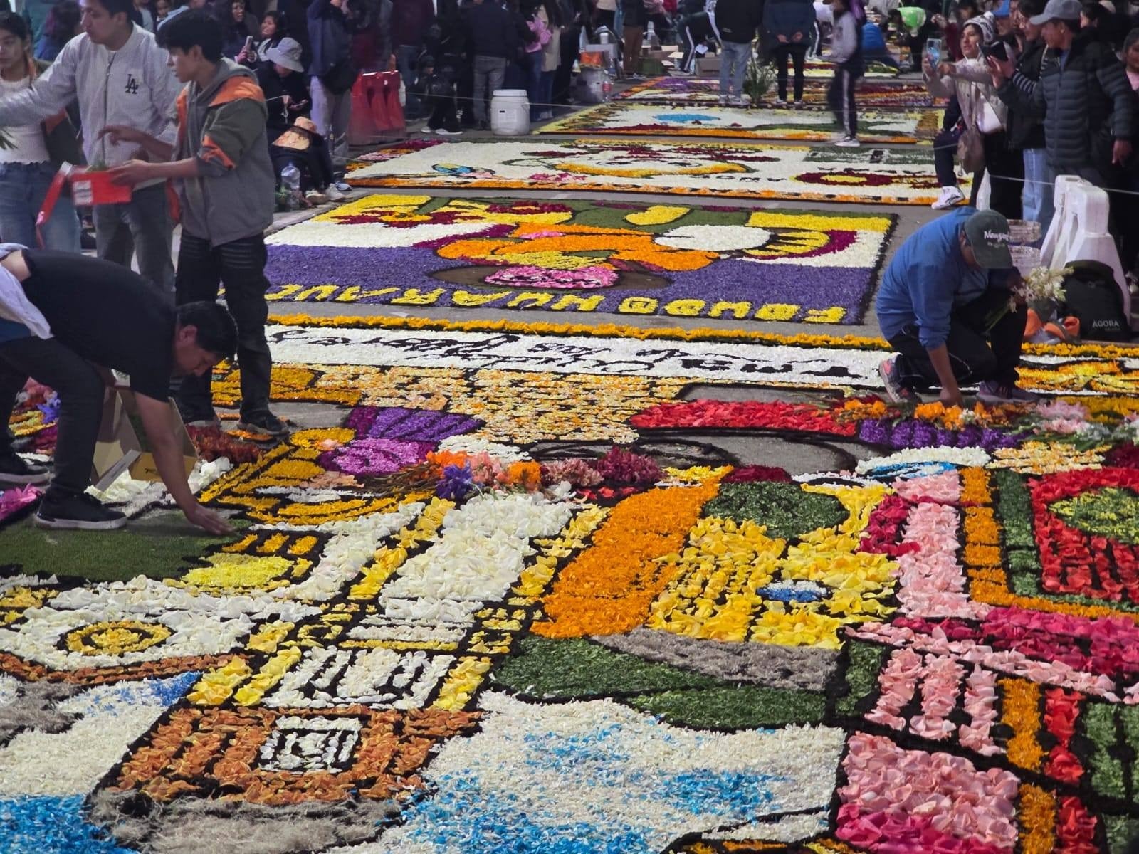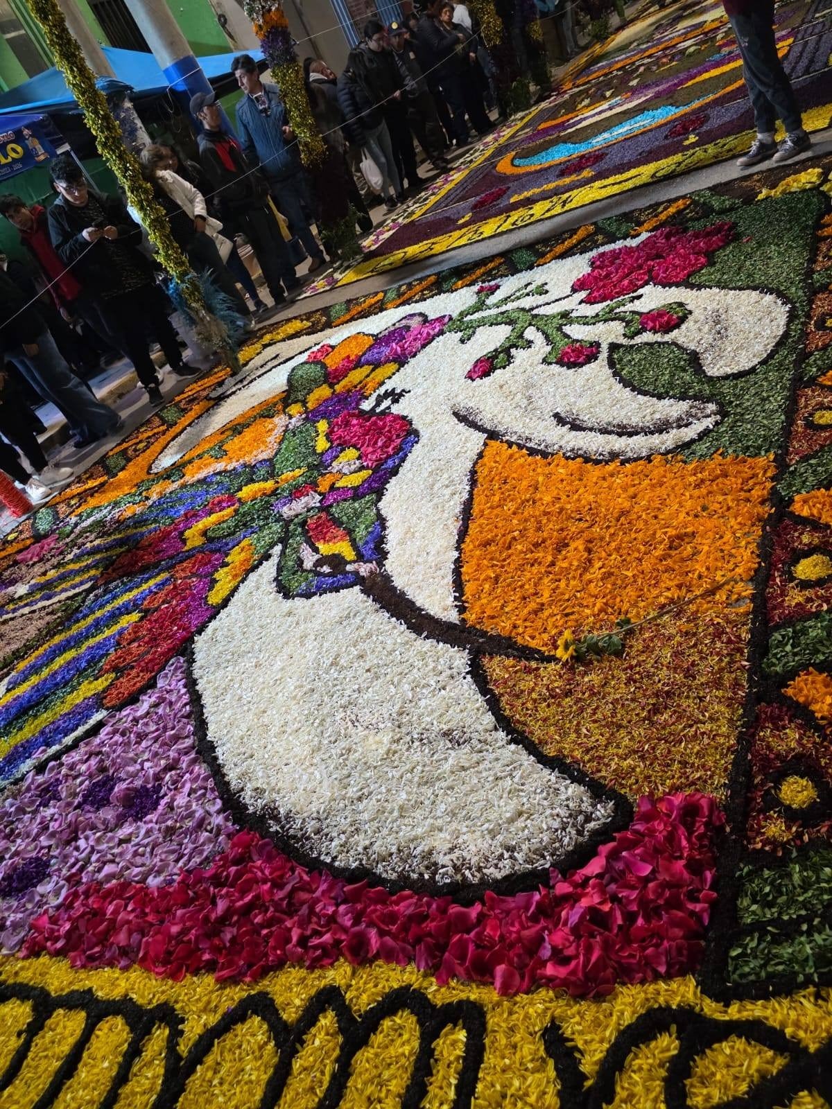 El perímetro de la Plaza de Armas, donde se ubica la Catedral de Santa Ana de Tarma, se transformó en un lienzo vivo cubierto por alfombras elaboradas con una exquisita variedad de flores naturales cultivadas en la zona. Rosas, claveles, margaritas, gladiolos, dalias y hortensias destacan entre las especies más utilizadas, gracias a la riqueza agrícola del valle tarmeño, reconocido por su producción floral de alta calidad.