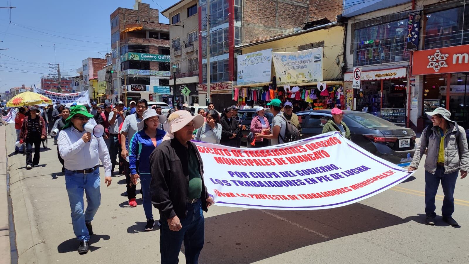 Cientos de trabajadores que integran los sindicatos en las municipalidades y otros organismos del Estado, se movilizaron por la Calle Real en Huancayo, luego de participar de un plenario, donde informaron de las limitaciones de la Ley N° 32103, norma que fue aprobada este año por el Congreso de la República promulgada por el Ejecutivo.
