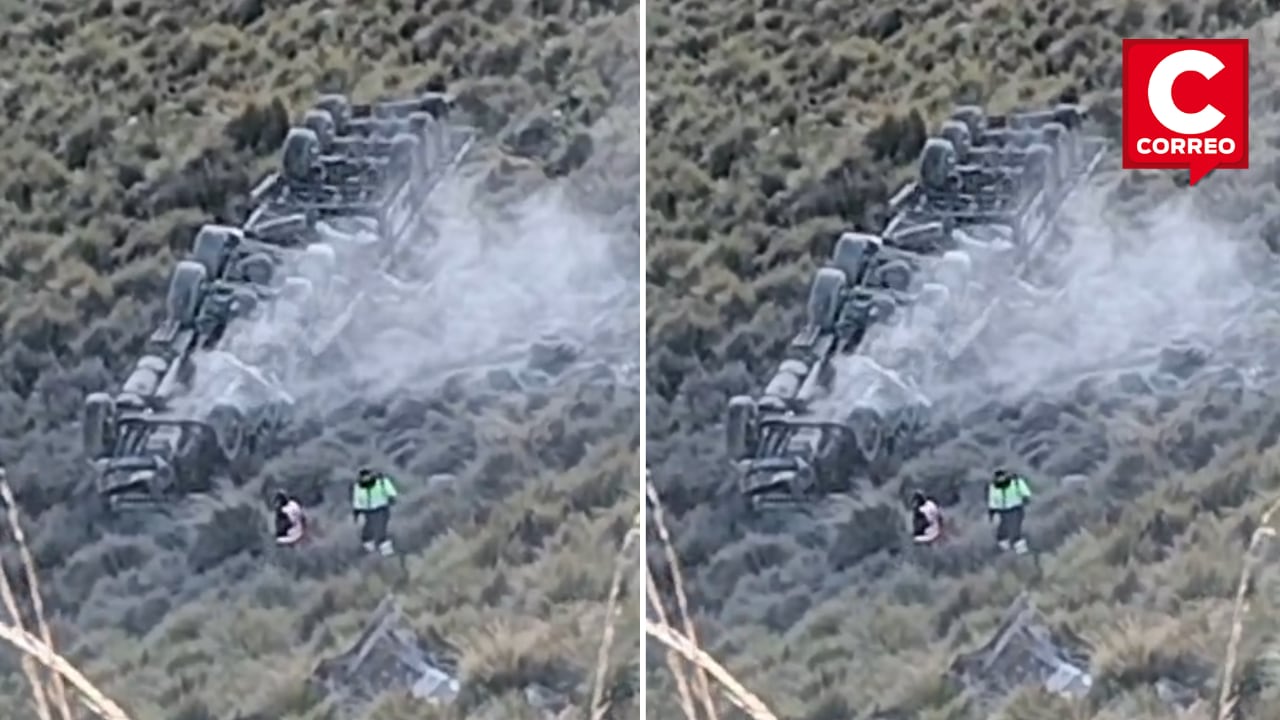 Según la información preliminar, un tráiler se despistó y terminó desbarrancándose varios metros, quedando con las llantas hacia arriba. El conductor de la unidad quedó atrapado dentro de la cabina tras el impacto.