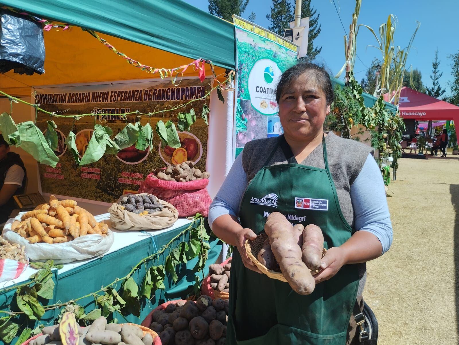 Los productores de papa nativa de Patalá, Pucará, también son parte del atractivo. Ayer exhibieron una papa de 30 centímetros de largo de la variedad huayro macho, que luego de sembrar en piso muy alto, está listo en 8 meses. Y las venden en cantidad para la producción de papitas chips, dijo la productora Nancy Castro de la cooperativa Casice que integra a 25 personas. Ellos ya exportan, porque su productos son orgánicos.