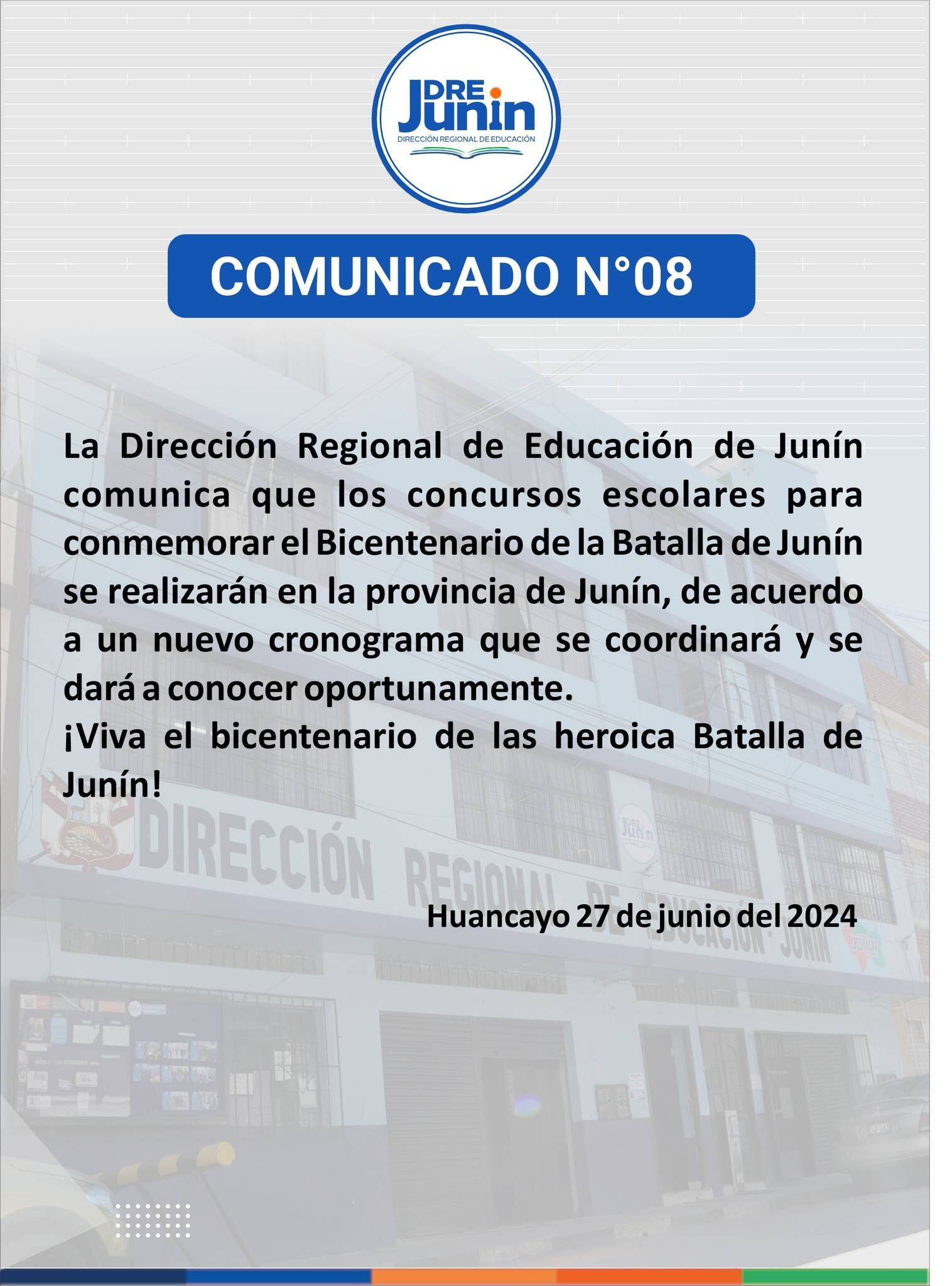 Acerca del segundo punto, surge a raíz de que los concursos escolares para conmemorar la Batalla de Junín y Ayacucho aparentemente se iban a realizar en Huancayo, lo que generó rechazo e indignación en los juninenses. Ante ello, el gobernador aseguró que todas las actividades se realizarán en la provincia. A los minutos la Dirección Regional de Educación emitió un comunicado.