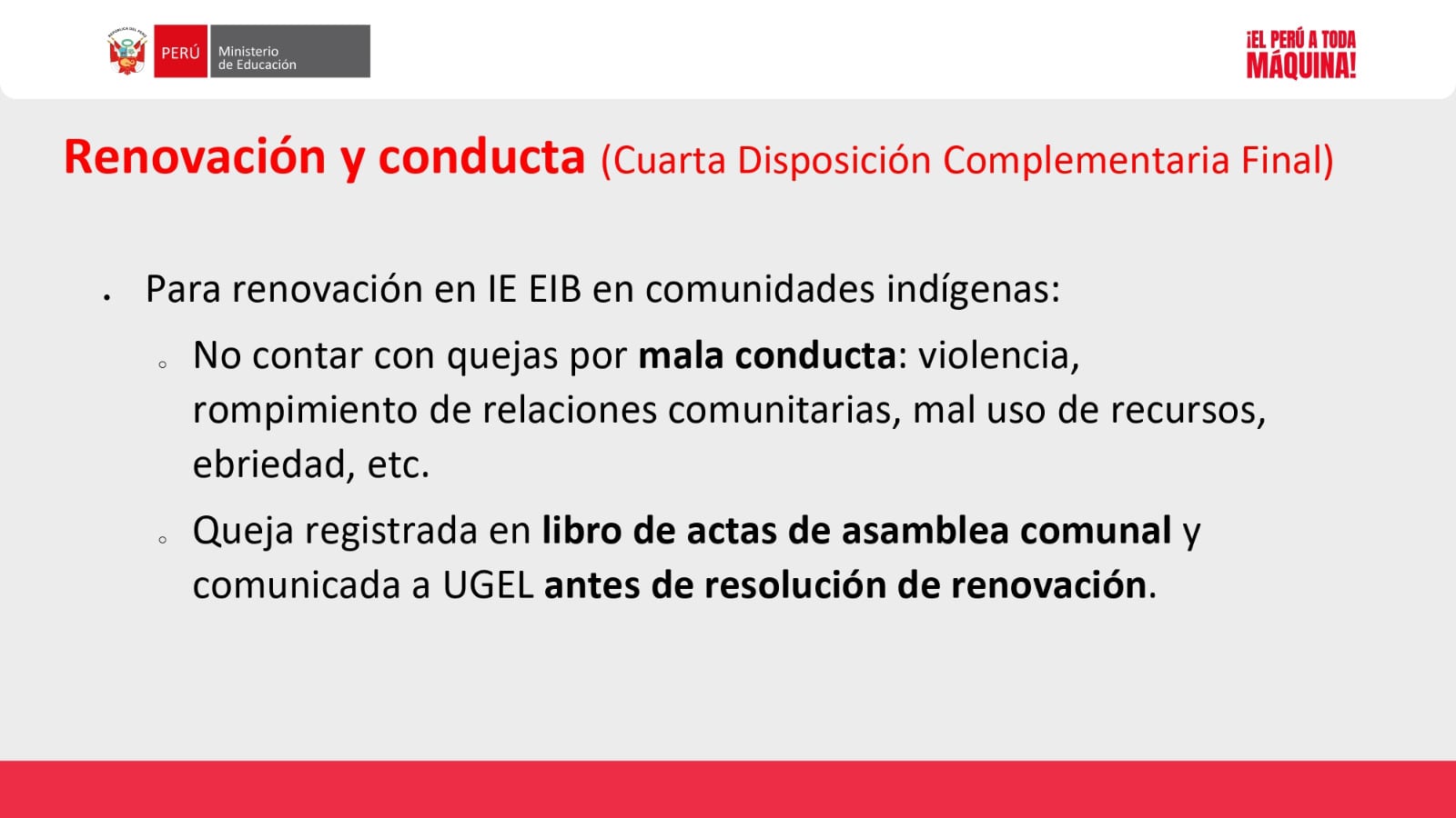 Para que estas faltas tengan efectos legales en el proceso de contratación, las quejas deben estar registradas en el libro de actas de la comunidad. Dichos reportes deben ser comunicados formalmente a la Unidad de Gestión Educativa Local (UGEL) antes de que se expida la resolución de renovación.