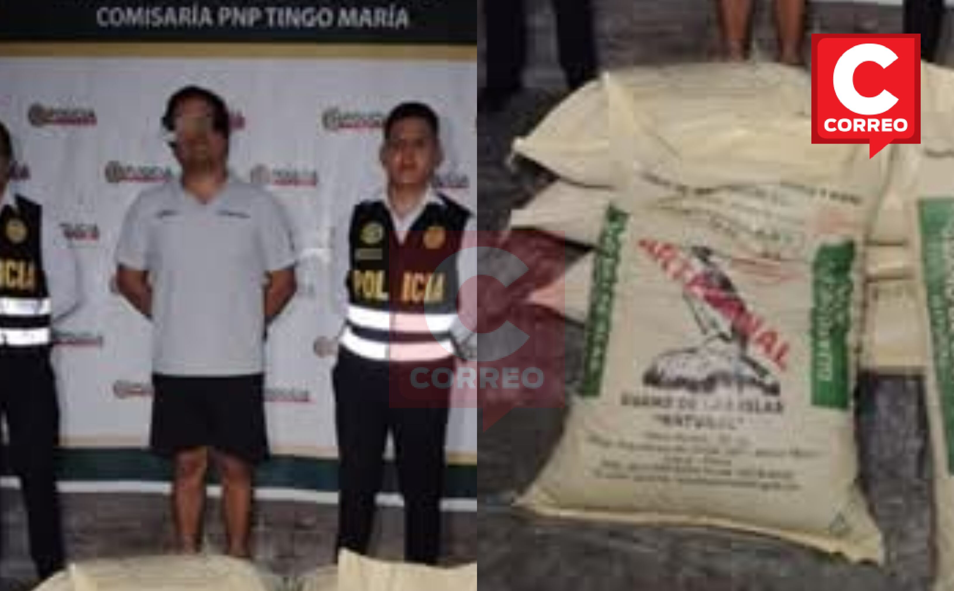 Durante la operación, los efectivos policiales encontraron ocho sacos de guano de isla con el sello “Prohibido su venta - Ministerio de Desarrollo Agrario y Riego”, pertenecientes a un lote sustraído del almacén de la Oficina Zonal de DEVIDA en Tingo María.