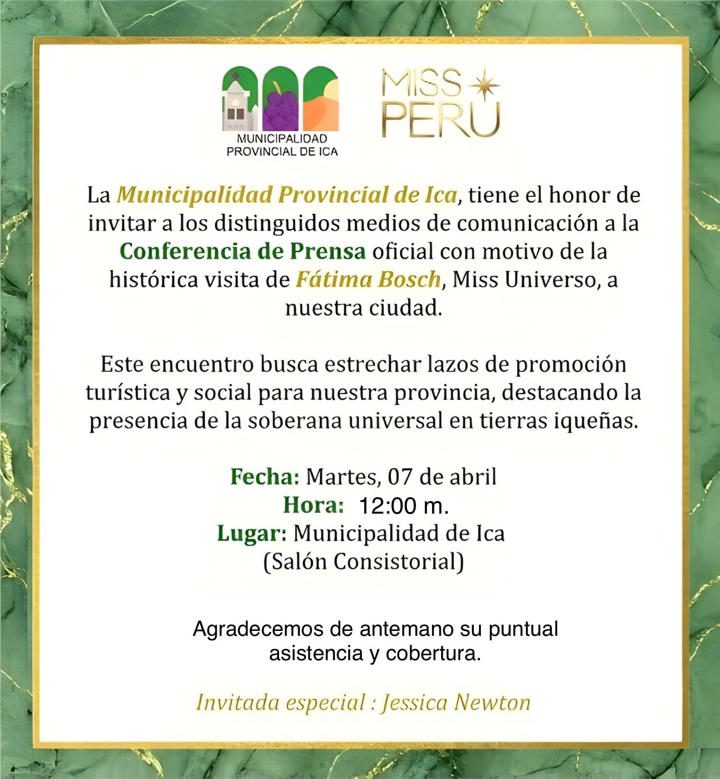 “La Municipalidad Provincial de Ica tiene el honor de invitar a los distinguidos medios de comunicación a la conferencia de prensa oficial con motivo de la histórica visita de Fátima Bosch, Miss Universo, a nuestra ciudad”, señala la invitación difundida.
