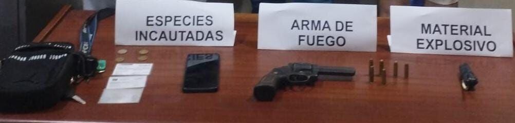 El detenido fue identificado como Jorge Luis Campos Pérez de 34 años, alias “Fresa”, de nacionalidad venezolana. Información policial señala que, al realizarle el registro personal, se le encontró un arma de fuego tipo revólver, marca Amadeo Rossi SA 38 Especial, con serie N° 120889, abastecida con seis municiones. También tenía un material explosivo, de color negro, envuelto con cinta aislante negra y una mecha de color blanco.