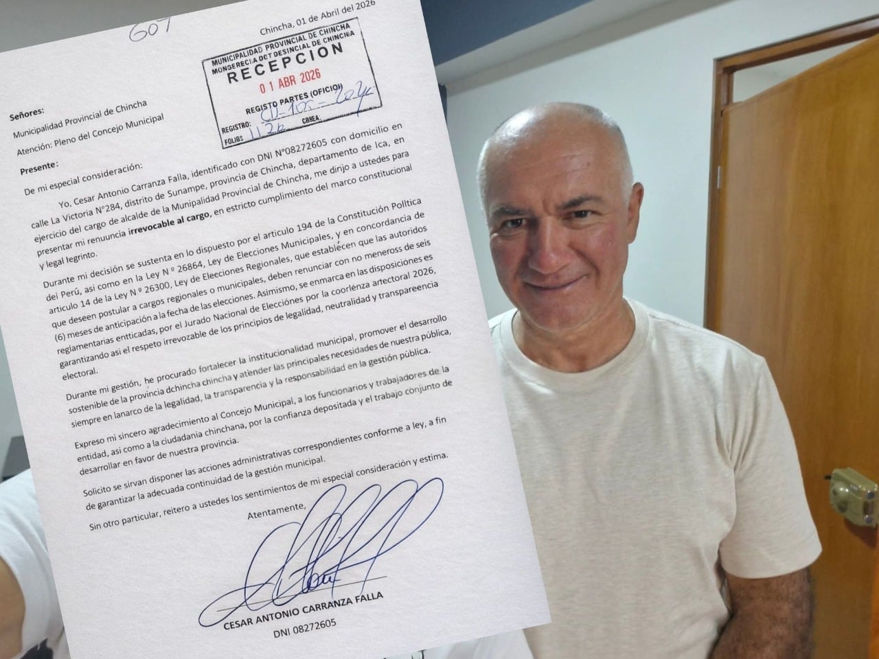 A los 3 años y tres meses de gestión, el alcalde de la Municipalidad Provincial de Chincha, César Antonio Carranza Falla, presentó su renuncia irrevocable al cargo. Ayer (1 de abril), ingresó su documento dirigido a la entidad con atención al concejo municipal en el que comunica su decisión de separarse de la administración municipal por su futura postulación a la región Ica en las elecciones del mes de octubre del 2026.