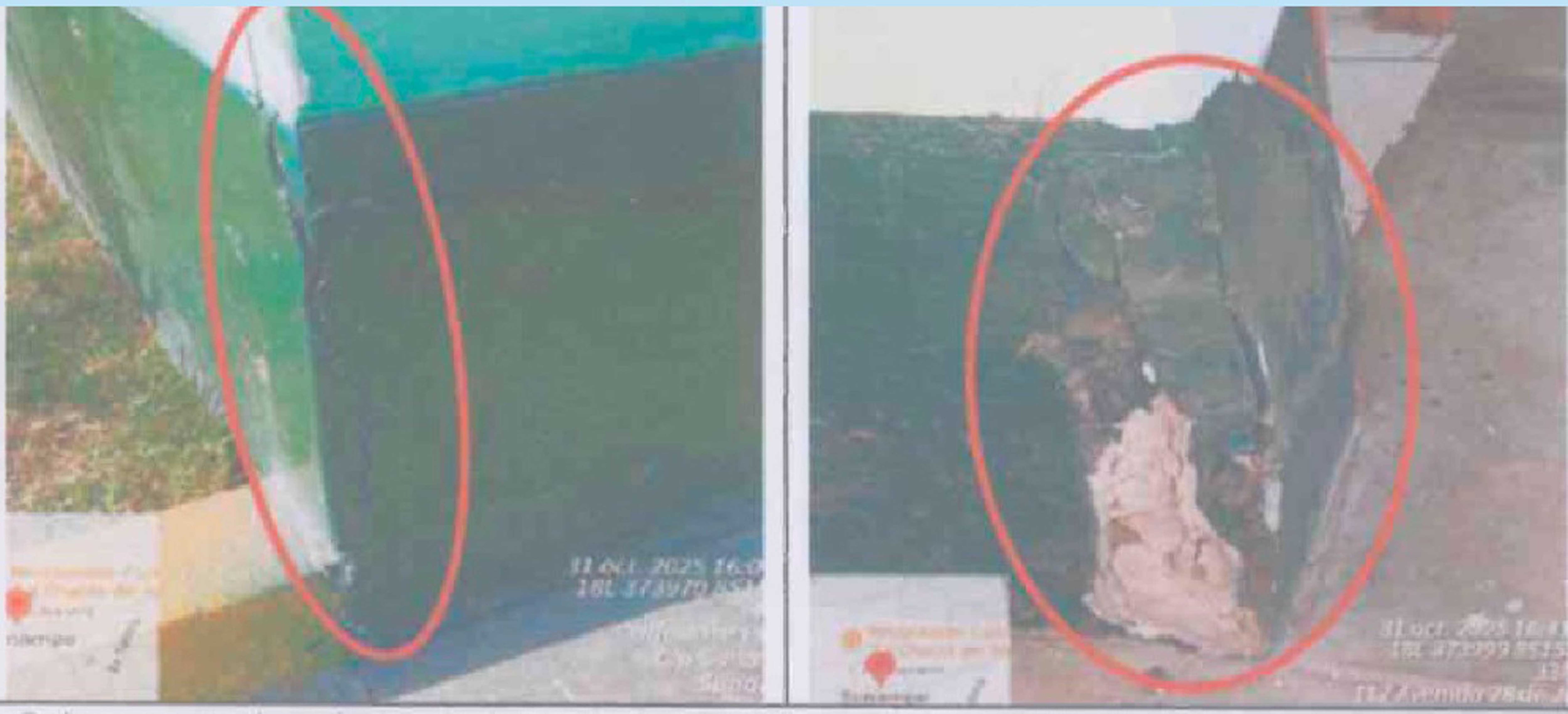 Según la comisión de control al inspeccionar el estado situacional de la infraestructura se evidenció “erosión en parte inferior de columnas, rajadura transversal en parte superior de columna, muros y techos con presencia de humedad y desprendimiento de pintura”. Estas situaciones se advierten en la fachada de la comisaría y también en la oficina de administración, en la sala de meditación, baños y otros ambientes.