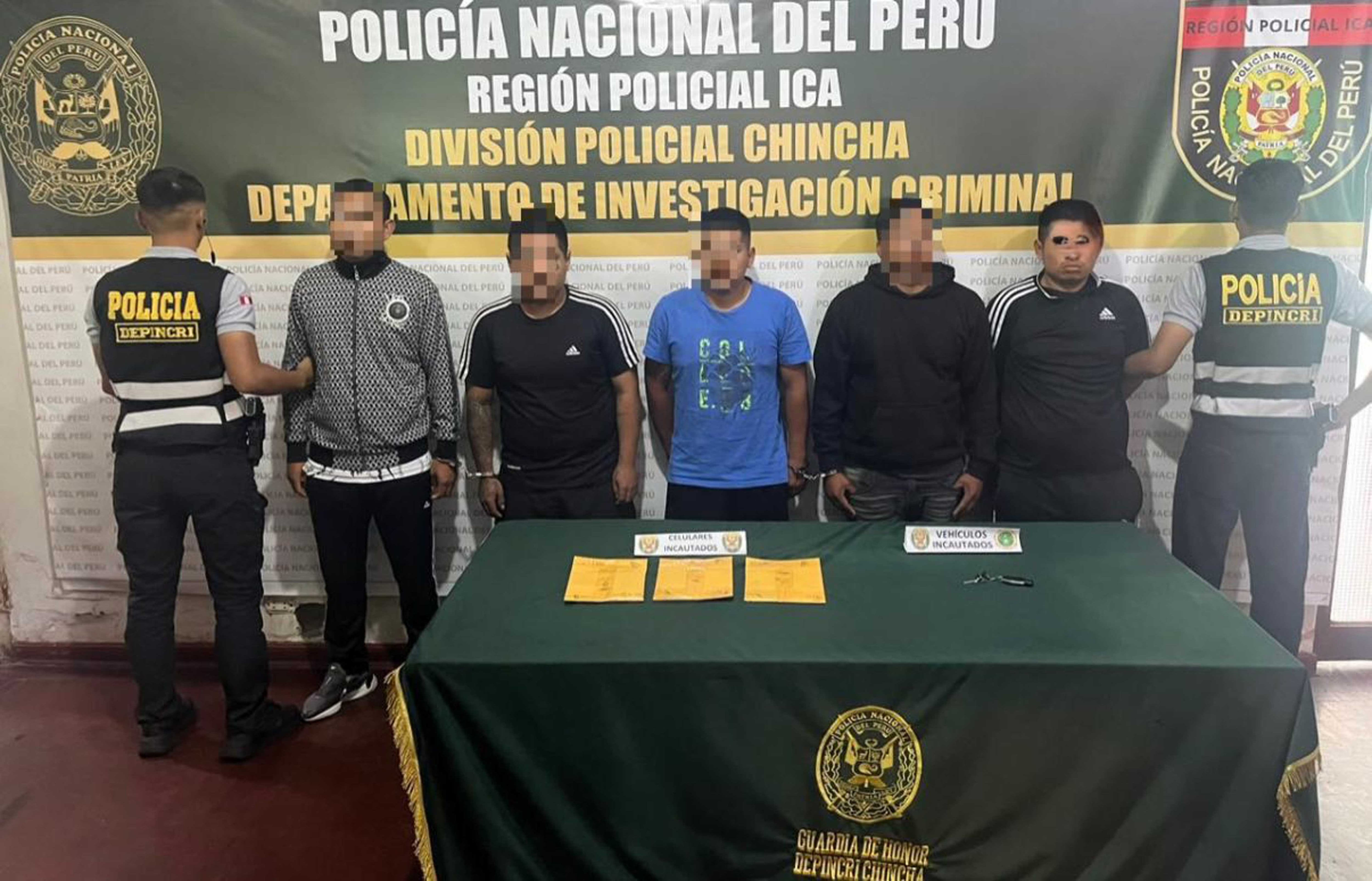 Cinco sujetos fueron intervenidos por la policía tras ser sindicados de haber participado en un presunto pedido de cupo a una conocida empresa de transportes. La detención a cargo de los agentes del Departamento de Investigación Criminal (Depincri) se produjo por inmediaciones de la calle Ernesto Velit, en la ciudad de Chincha, en circunstancias que los sospechosos se desplazaban a bordo de un mototaxi.