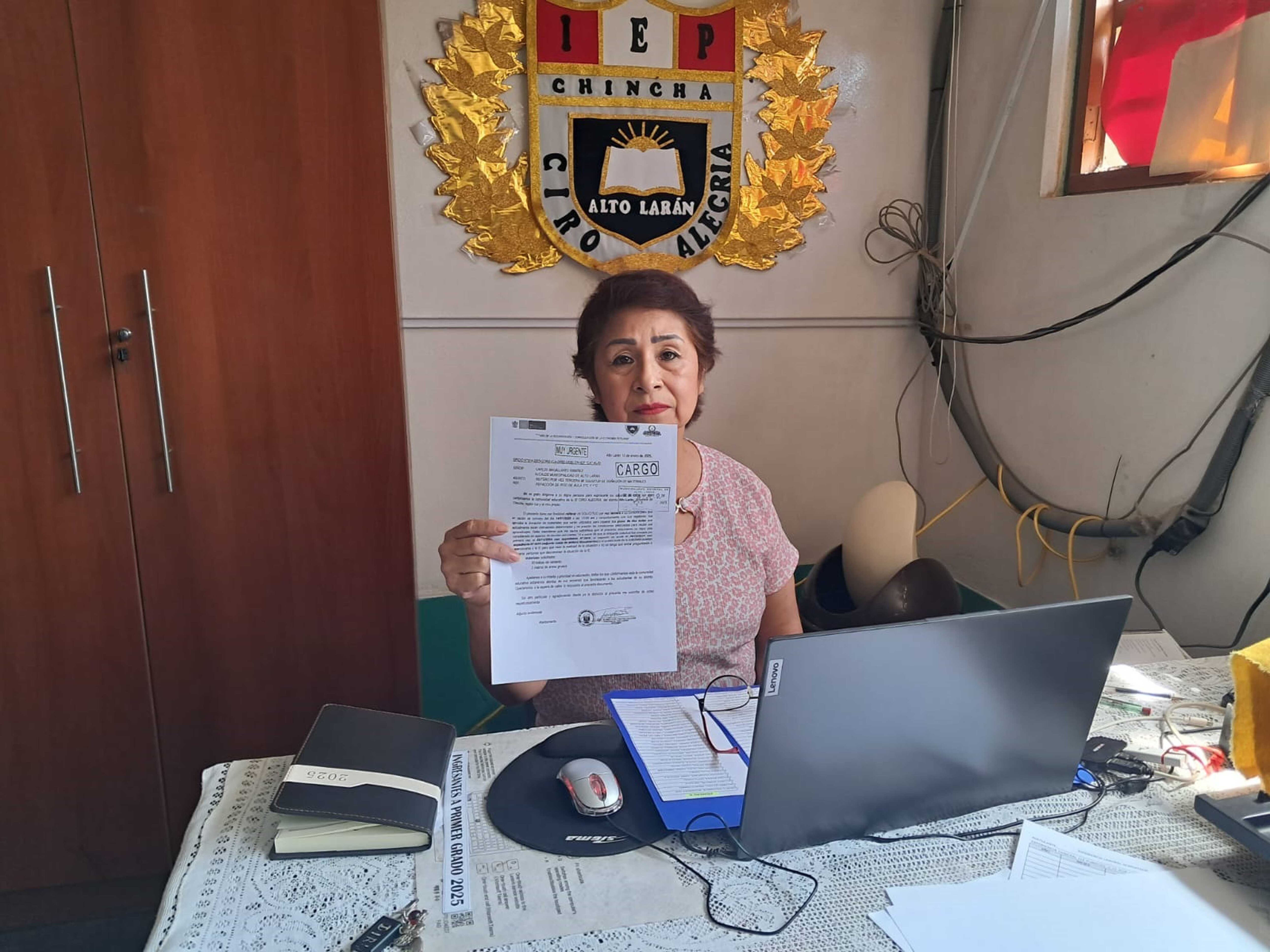 Tasayco comentó que el 2 de diciembre del año pasado, antes de que culmine el año escolar, presentó una solicitud a la entidad, requiriendo cemento y arena gruesa para el mejoramiento del piso de dos aulas del colegio con Jornada Escolar Completa. La respuesta no llegó y el 26 de diciembre, la directora vuelve a cursar documentación al alcalde Magallanes Ramírez para reiterar el apoyo para el sector Educación.