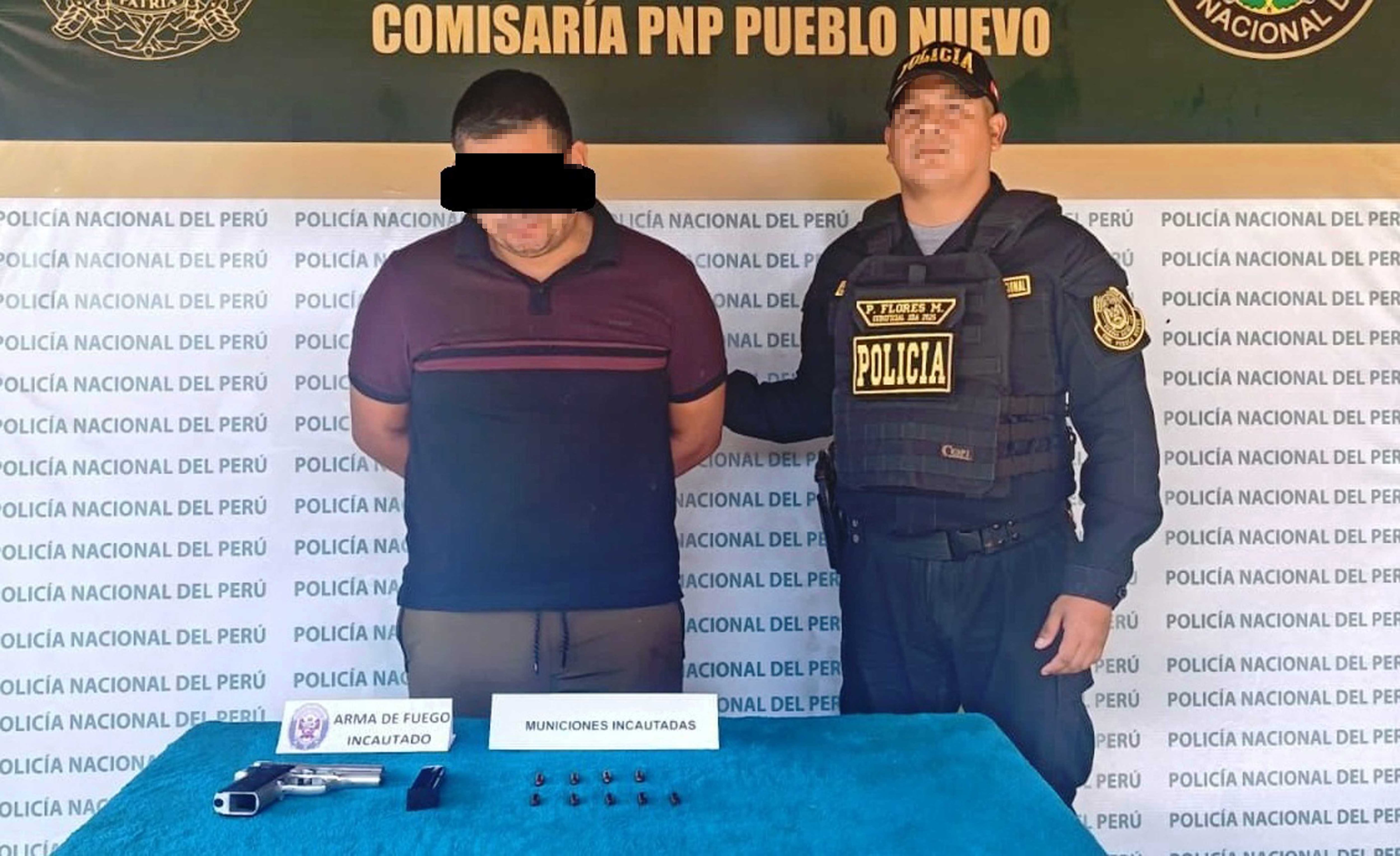 Los efectivos de la comisaría del distrito de Pueblo Nuevo, en el asentamiento humano Miguel Grau, realizaron la detención de un sujeto, sindicado de ingresar a la propiedad de un vecino y amenazarlo con pistola para cobrarle una deuda económica. En la intervención se decomisó el arma de fuego, y el sospechoso fue puesto a disposición de la delegación local para las investigaciones correspondientes.