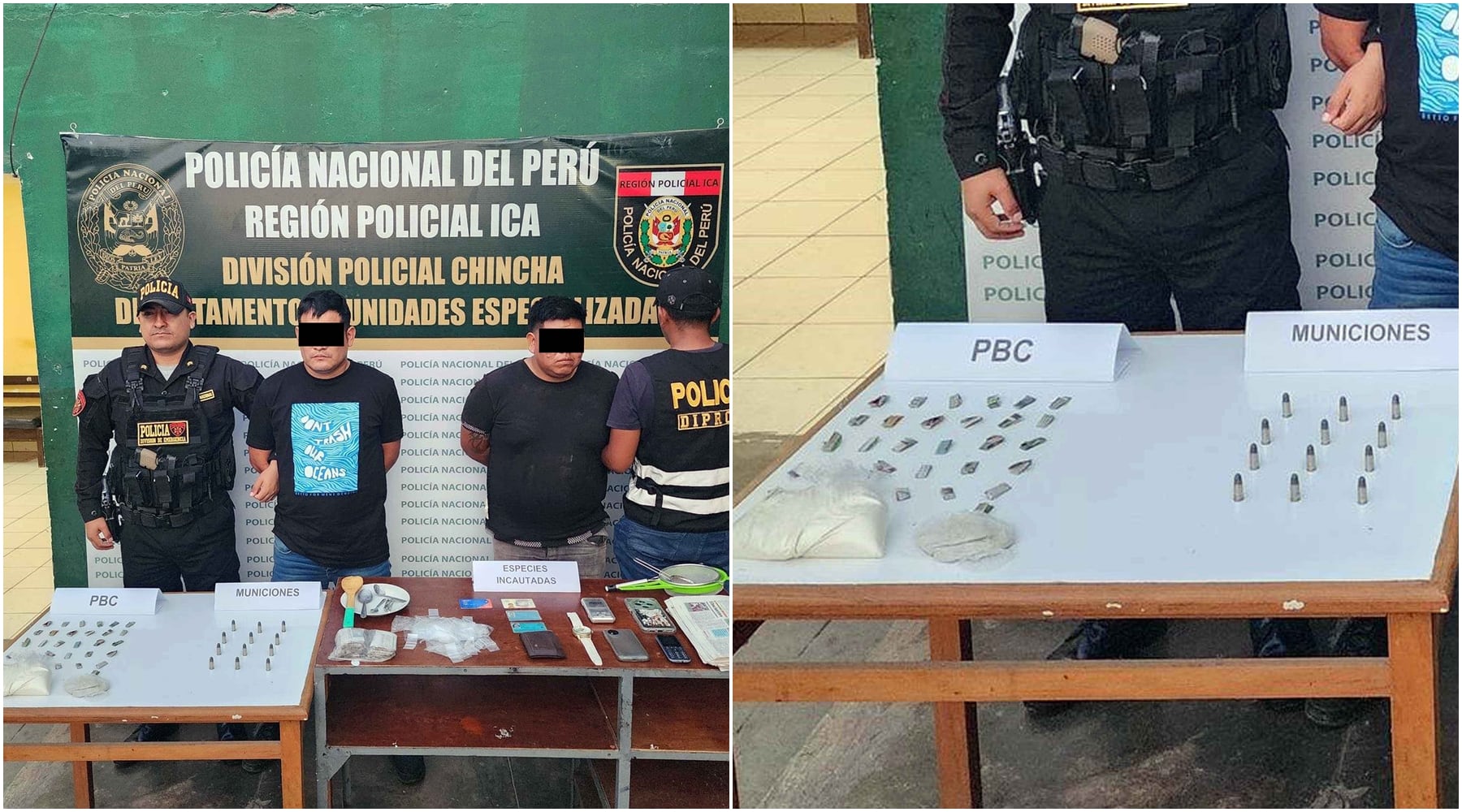 La detención de los sospechosos se realizó en la segunda cuadra de la calle Callao, a pocos metros de la sede de la Unidad de Gestión Educativa Local de Chincha, en circunstancias que estos permanecían en una trimoto. En el registro personal y vehicular se encontró al menos 30 ketes con sustancia blanquecina, al parecer, pasta básica de cocaína, que estaban preparados para su micro comercialización.
