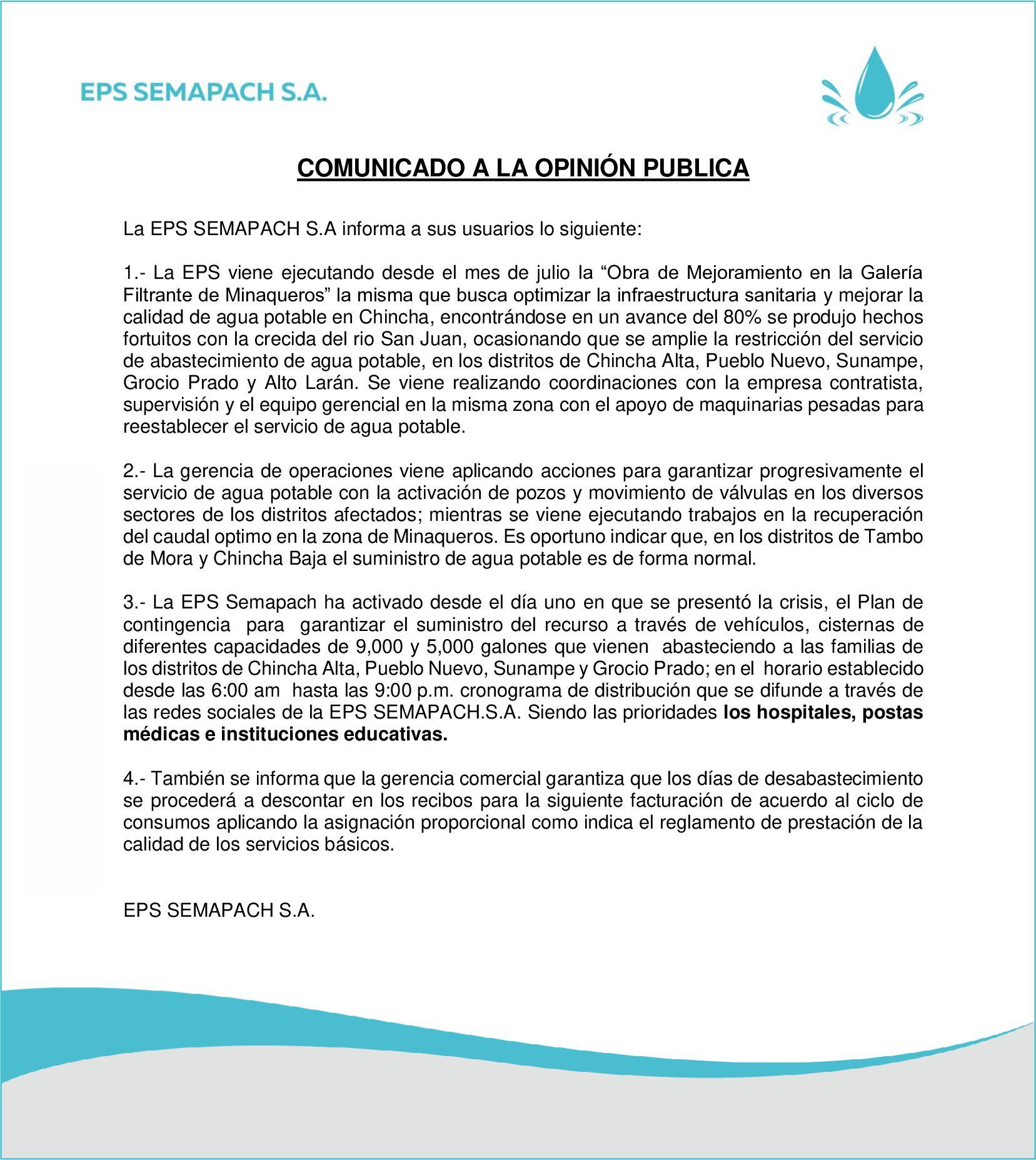 La EPS emitió un comunicado, indicando que se viene ejecutando desde el mes de julio la “Obra de Mejoramiento en la Galería Filtrante de Minaqueros” la misma que busca optimizar la infraestructura sanitaria y mejorar la calidad de agua potable en Chincha, encontrándose en un avance del 80 %, y se produjo hechos fortuitos con la crecida del río San Juan, ocasionando que se amplíe la restricción del servicio de abastecimiento de agua potable, en los distritos de Chincha Alta, Pueblo Nuevo, Sunampe, Grocio Prado y Alto Larán.