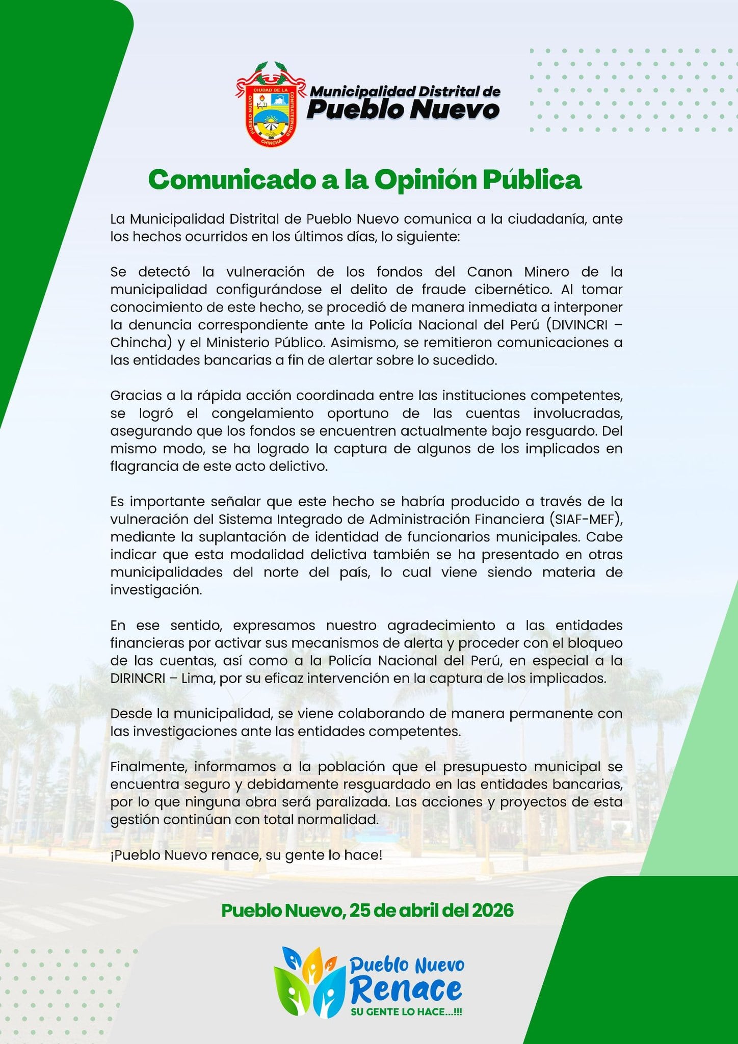 En tanto, la Municipalidad Distrital de Pueblo Nuevo, informó que se detectó la vulneración de los fondos del Canon Minero de la municipalidad configurándose el delito de fraude cibernético.