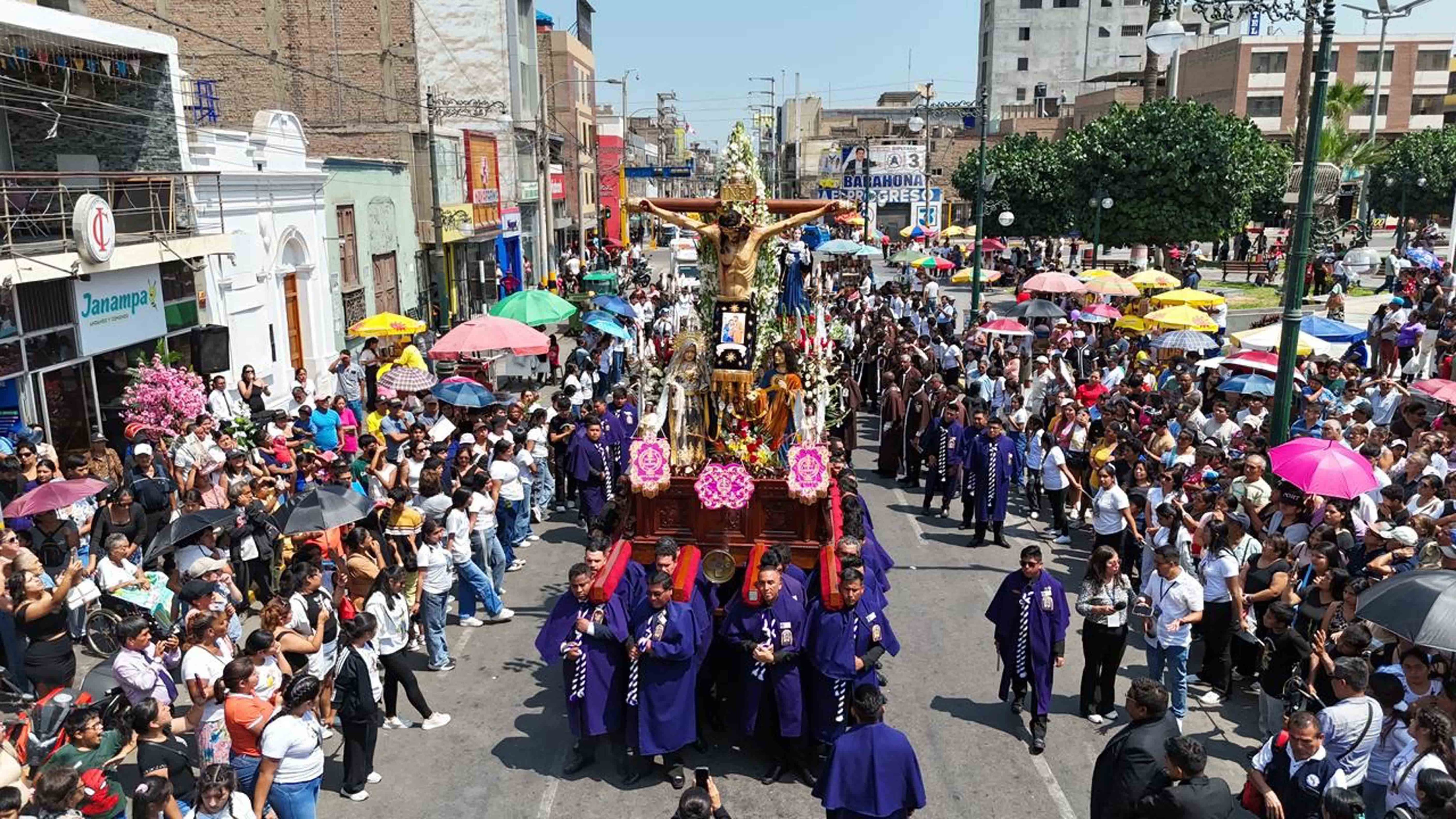 La mañana de ayer Sábado de Gloria, la sagrada imagen del Señor Crucificado de Chincha ingresó a la plaza mayor de la ciudad como parte del último tramo de su recorrido. Fueron 19 horas de procesión por diferentes avenidas y calles en las que fue recibido por la comunidad y diversas instituciones. Asimismo, en el retorno a la parroquia Santo Domingo de Guzmán acompañaron cientos de devotos.