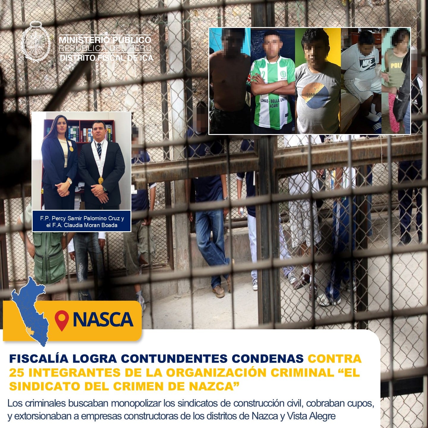 La investigación y posterior acusación estuvieron a cargo del Fiscal Provincial Titular, Dr. Percy Samir Palomino Cruz, con la participación de la Fiscal Adjunta Claudia Morán Boada, quienes demostraron la responsabilidad penal de los acusados en una serie de graves delitos vinculados al control violento de los sindicatos de construcción civil en la provincia de Nazca.