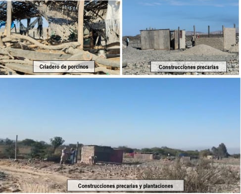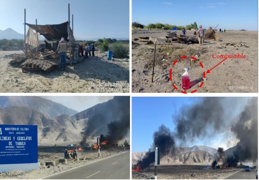 Por otra parte, en los Geoglifos de Taruga se detectó ocupación informal con construcciones precarias, criaderos de cerdos y plantaciones dentro de la zona intangible. Aunque la Dirección Desconcentrada de Cultura de Ica, con apoyo policial, realizó desalojos y retiró viviendas rústicas, aún permanecen estructuras y corrales por la resistencia de algunos pobladores.