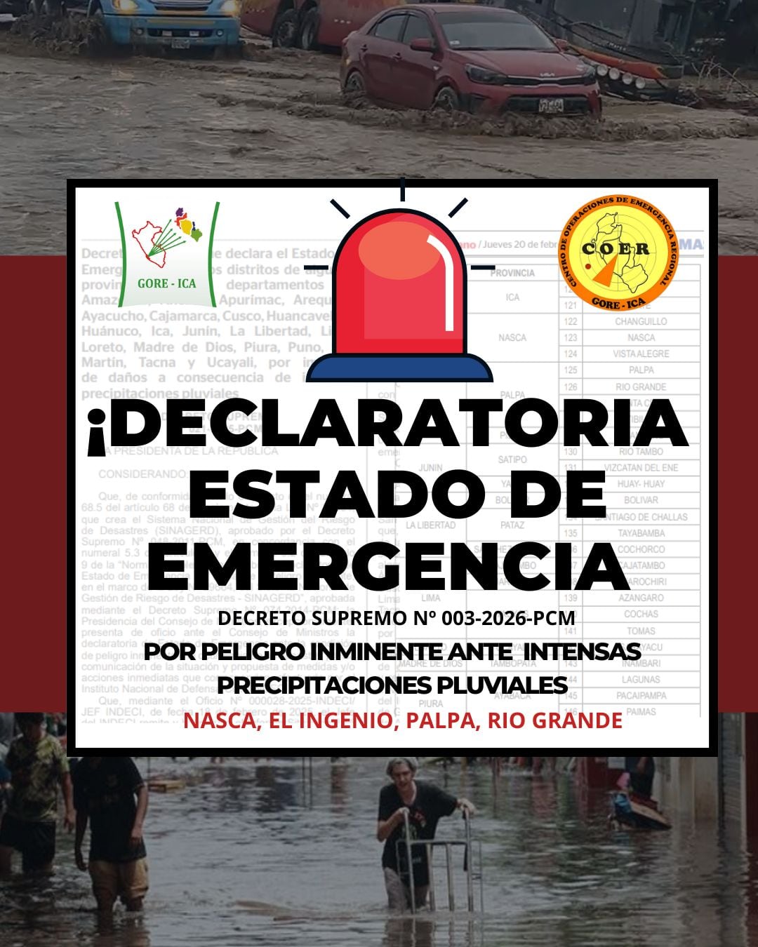 Los distritos de Nasca, El Ingenio, Palpa y Río Grande fueron declarados en Estado de Emergencia por un periodo de 60 días, debido al peligro inminente de lluvias intensas, según lo establecido en el Decreto Supremo N.º 003-2026-PCM, emitido por el Gobierno Central.