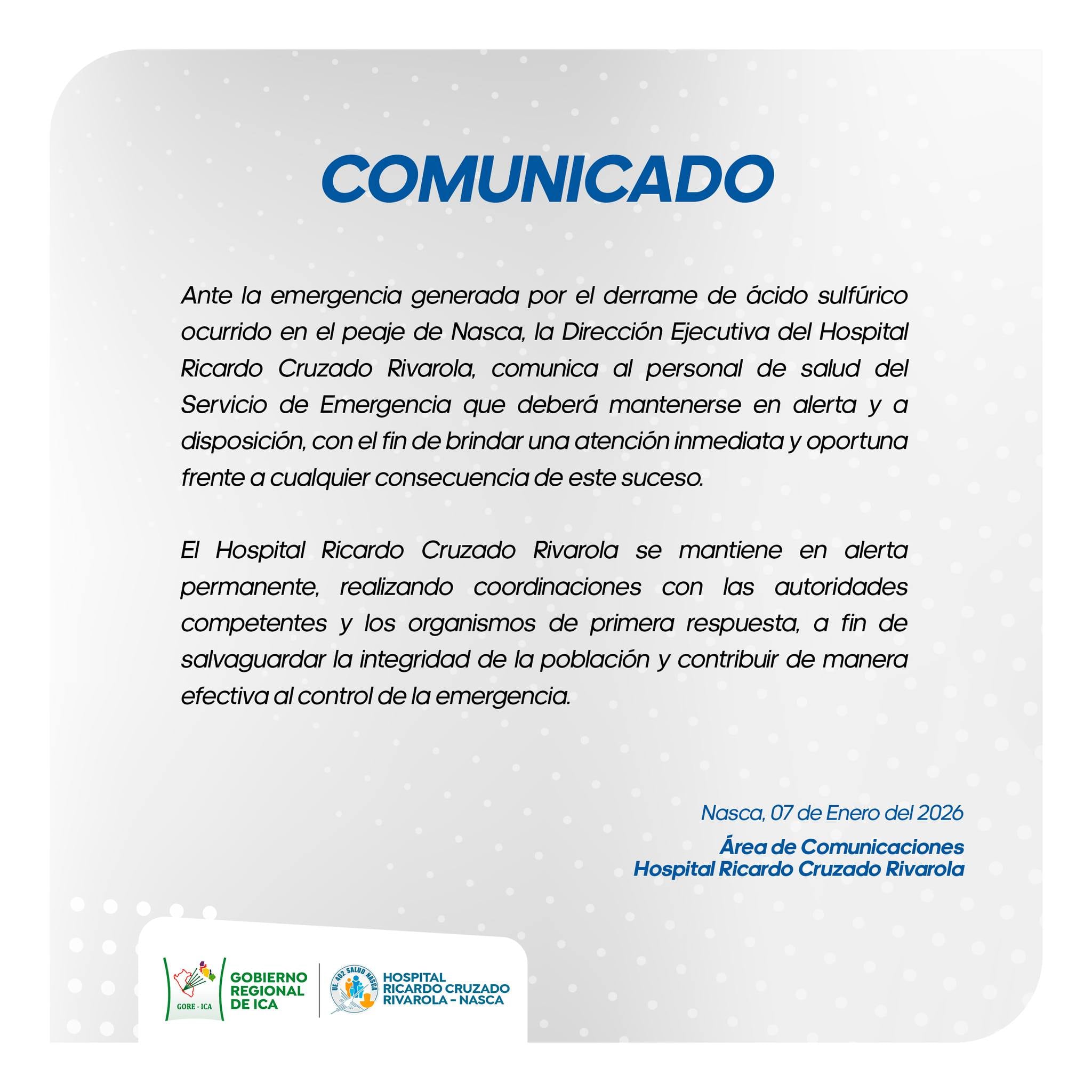 “Ante la emergencia generada por el derrame de ácido sulfúrico ocurrido en el peaje de Nasca, la Dirección Ejecutiva del Hospital Ricardo Cruzado Rivarola, comunica al personal de salud del Servicio de Emergencia que deberá mantenerse en alerta y a disposición, con el fin de brindar una atención inmediata y oportuna frente a cualquier consecuencia de este suceso. El Hospital Ricardo Cruzado Rivarola se mantiene en alerta permanente, realizando coordinaciones con las autoridades competentes y los organismos de primera respuesta, a fin de salvaguardar la integridad de la población y contribuir de manera efectiva al control de la emergencia”, señaló el Hospital Ricardo Cruzado Rivarola.