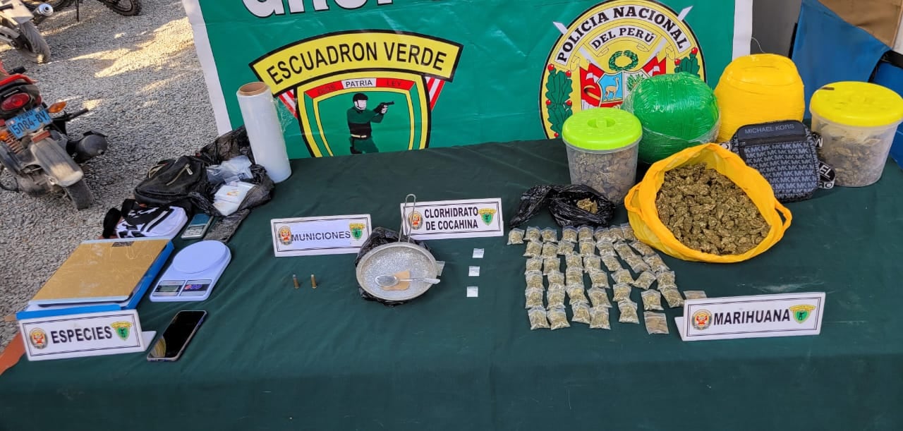 Durante el registro domiciliario —realizado en el marco de flagrancia delictiva—, la Policía halló aproximadamente nueve kilos de marihuana en tallos secos, tres envoltorios de clorhidrato de cocaína, dos municiones, tres celulares, una mototaxi de placa 4879-6Y, dinero en efectivo y otros elementos que serían clave para las investigaciones. Todo el material fue incautado y trasladado como evidencia para el Ministerio Público.