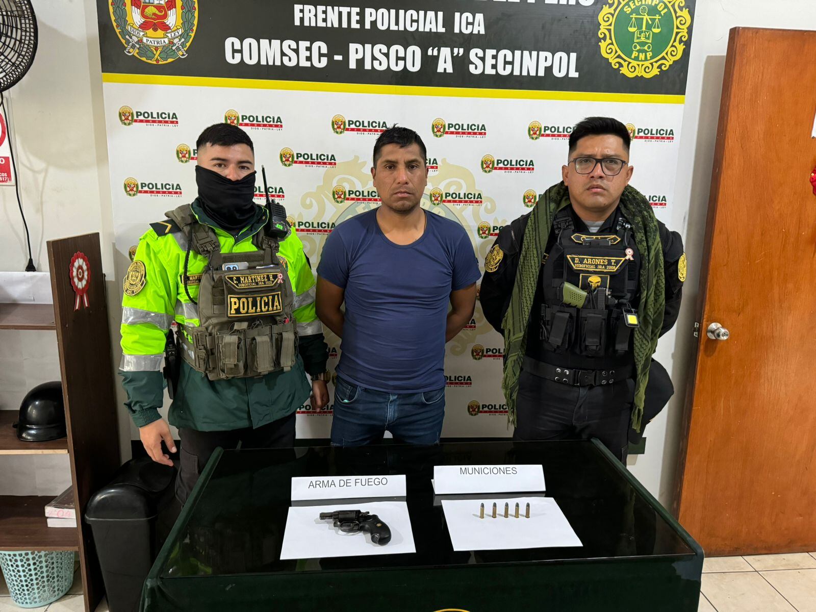 Durante el registro personal, los efectivos policiales encontraron un arma de fuego (revólver) de color negro, marca Smith & Wesson calibre 38, con cinco (05) municiones abastecidas en el tambor, siendo conducido por medidas de seguridad a la comisaría sectorial de Pisco.