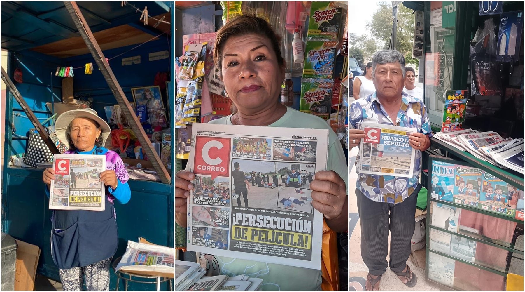 En Chincha, Amparo Torres sale todos los días desde muy temprano de su casa para abrir su puesto de periódico. Desde las 6 de la mañana, los impresos ya están en exhibición y entre ellos resalta la edición de Correo Ica. Ella prácticamente empezó su labor con Correo hace 20 años. Su trabajo le permite no solo estar informada de las noticias regionales desde Nasca hasta Chincha, sino además paliar las necesidades económicas de su familia. Amparo se ubica en la primera cuadra de la calle José Faustino Sánchez Carrión, siendo la primera en recibir con sus noticias impresas a las amas de casa que ingresan con dirección al mercado de Chincha Alta.