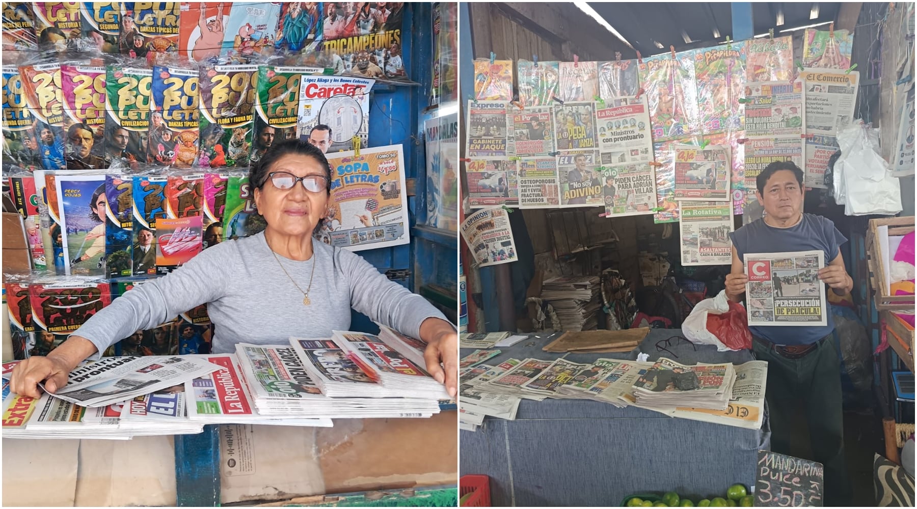 En otra esquina emblemática entre la calle La Mar con la avenida Grau, está Narcisa Escobar Araujo de 73 años, también ha dedicado cerca de cinco décadas a la venta de diarios. Relata que el negocio fue heredado de su suegro, fundador y miembro de un sindicato de “Canillitas”, y que con el paso del tiempo se convirtió en una tradición familiar que ha pasado de generación en generación. Actualmente, su hijo la apoya en la atención del puesto.