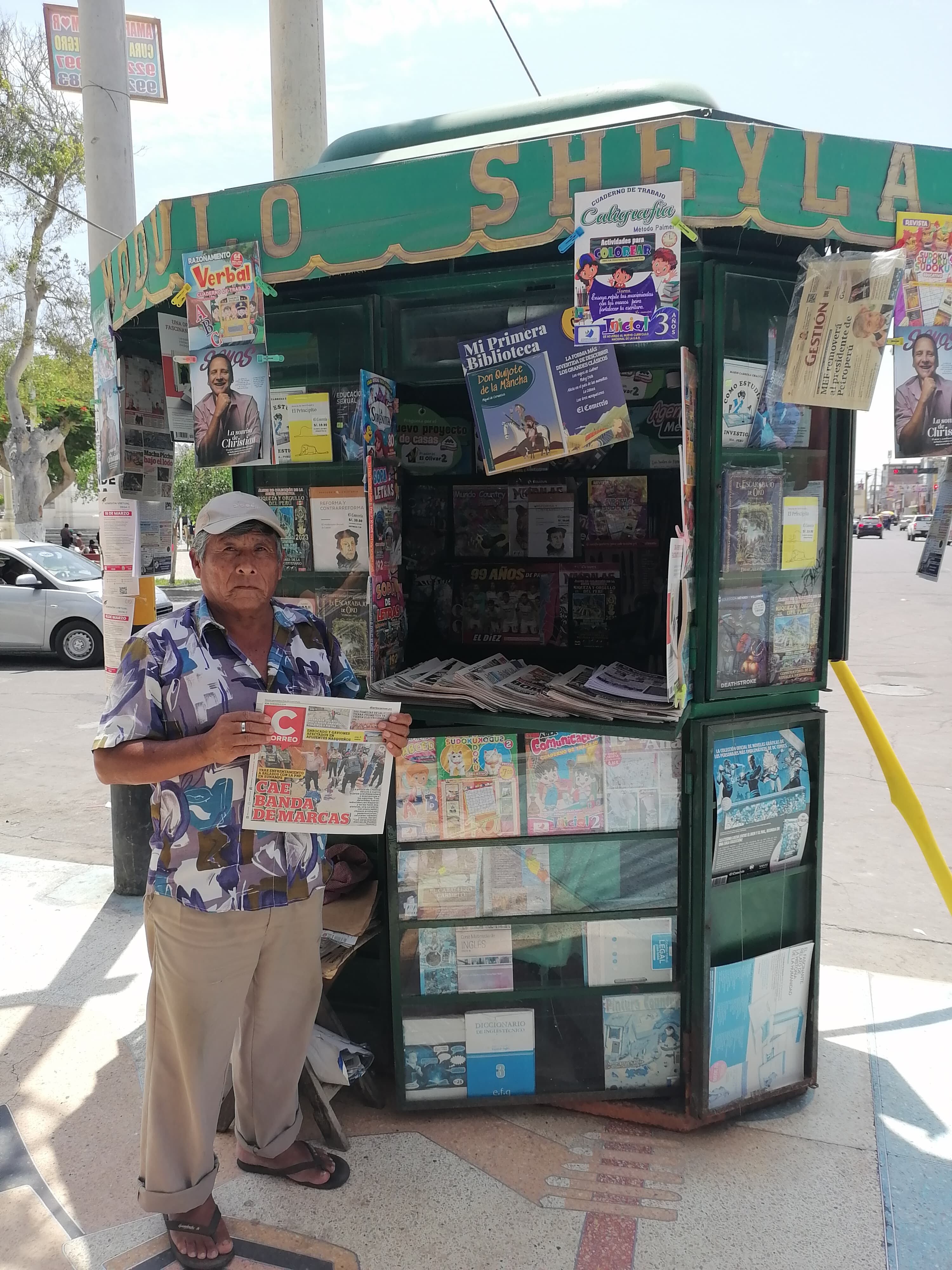 En Chincha tenemos a Julio Utcañe, su puesto está ubicado entre calle 28 de Julio, Italia y plaza de Armas. 25 años en el negocio, lo heredó de su madre fallecida. Ella tenía 50 años aproximadamente vendiendo diarios en la provincia.