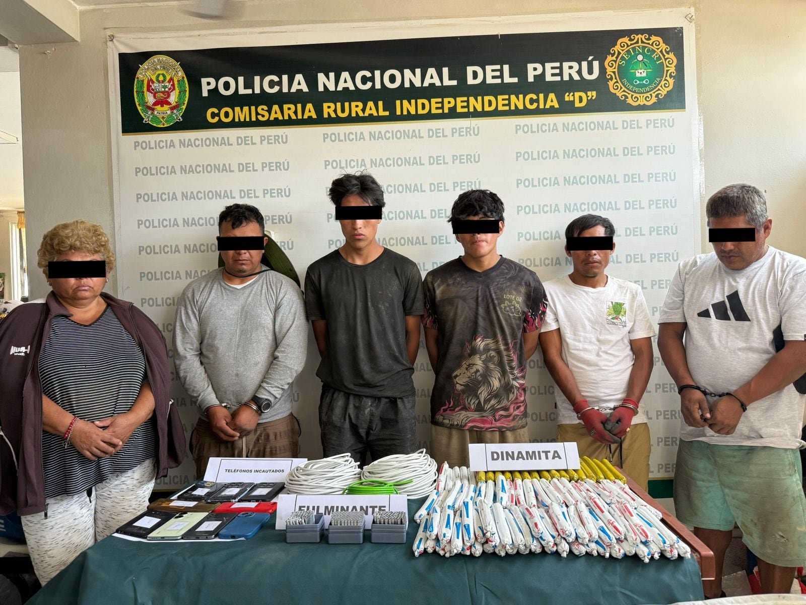 Como resultado del operativo, fueron detenidas seis personas identificadas como Doris Victoria García Pantigoso (58), alias “Tía Lucila”; Alberto Hamilton Rojas Aponte (32), “Timón”; Víctor Augusto Torrealva Dávila (44), “Chino”; Edinson Eulogio Noreña (22), “Araña”; Russell Lagos Maccerhua (39), “Ruso”; y Omar Danilo Rojas Jesús (19), “Cachorro”, quienes son investigados por su presunta participación en actividades ilícitas vinculadas a la explotación ilegal de minerales.