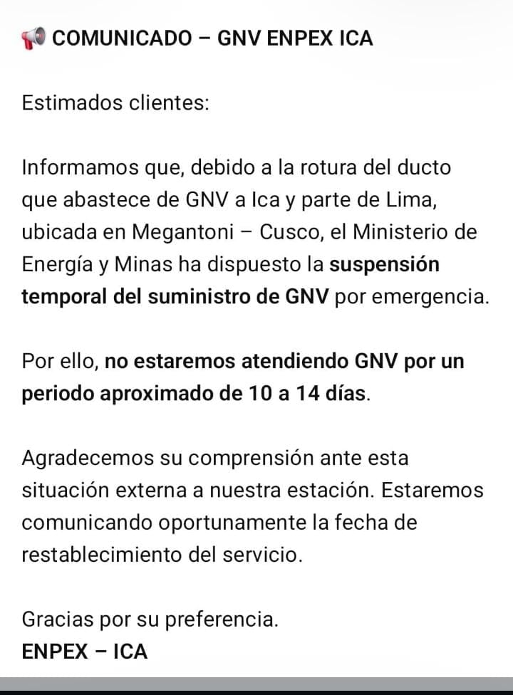 La región Ica enfrentaría un desabastecimiento de Gas Natural Vehicular (GNV) que podría extenderse entre 10 y 14 días, tras la ruptura de un ducto en Megantoni, en la región Cusco, hecho que motivó la declaratoria de emergencia del suministro a nivel nacional por parte del Ministerio de Energía y Minas.